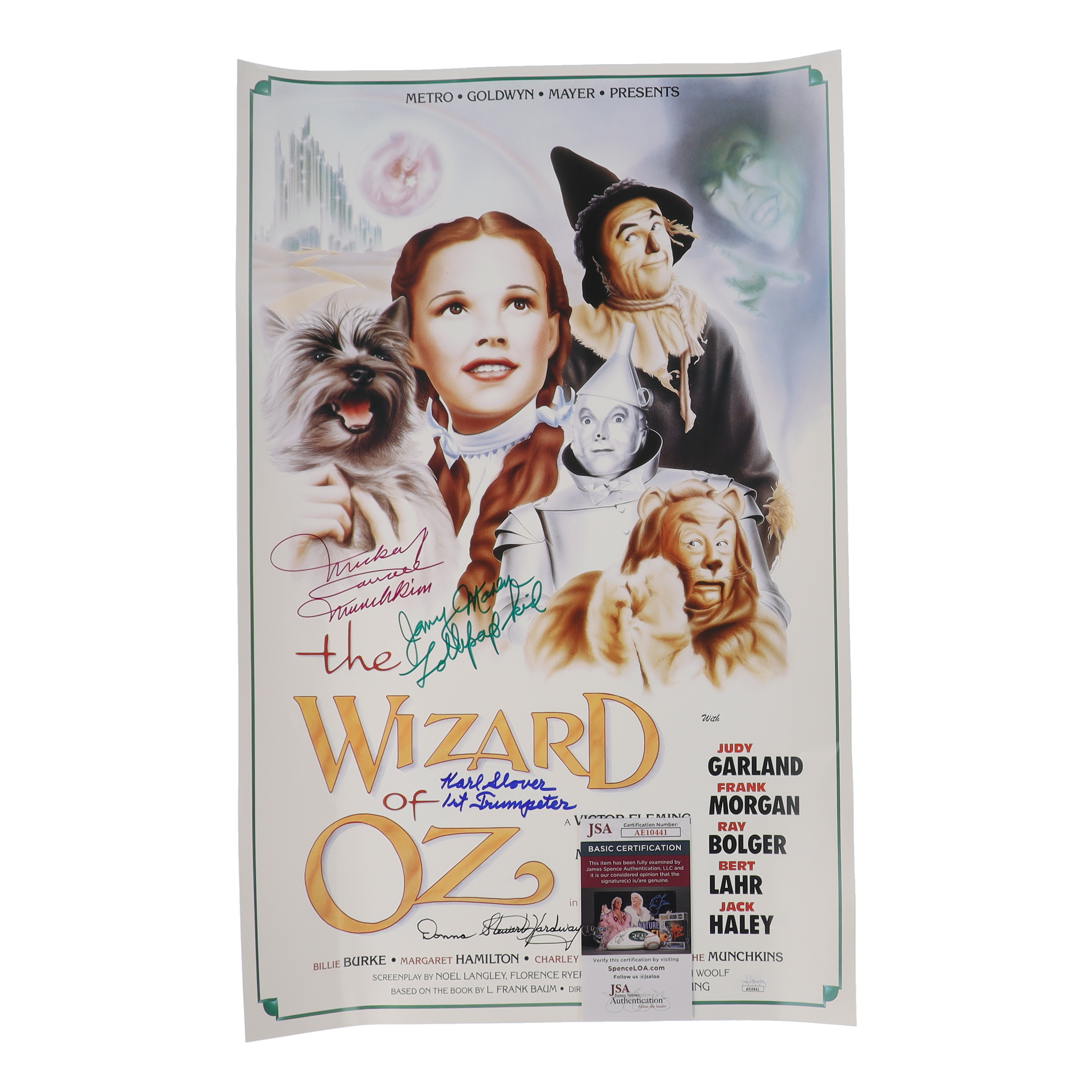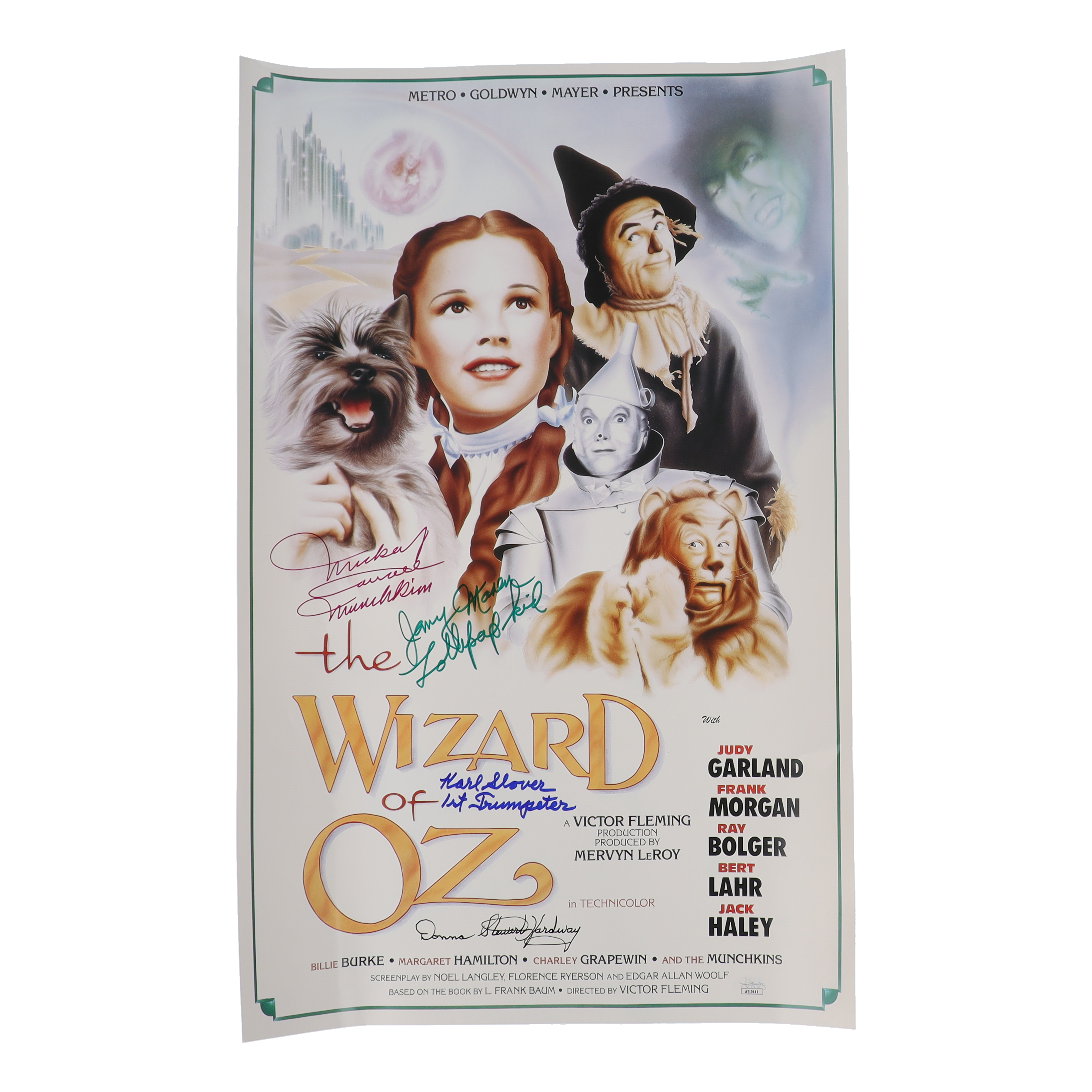 "The Wizard of Oz" 15x24 Movie Poster Photo Signed By (4) with Mickey Carroll, Jerry Maren, Karl Slover, Donna Stewart-Hardway With Character Inscriptions (JSA)