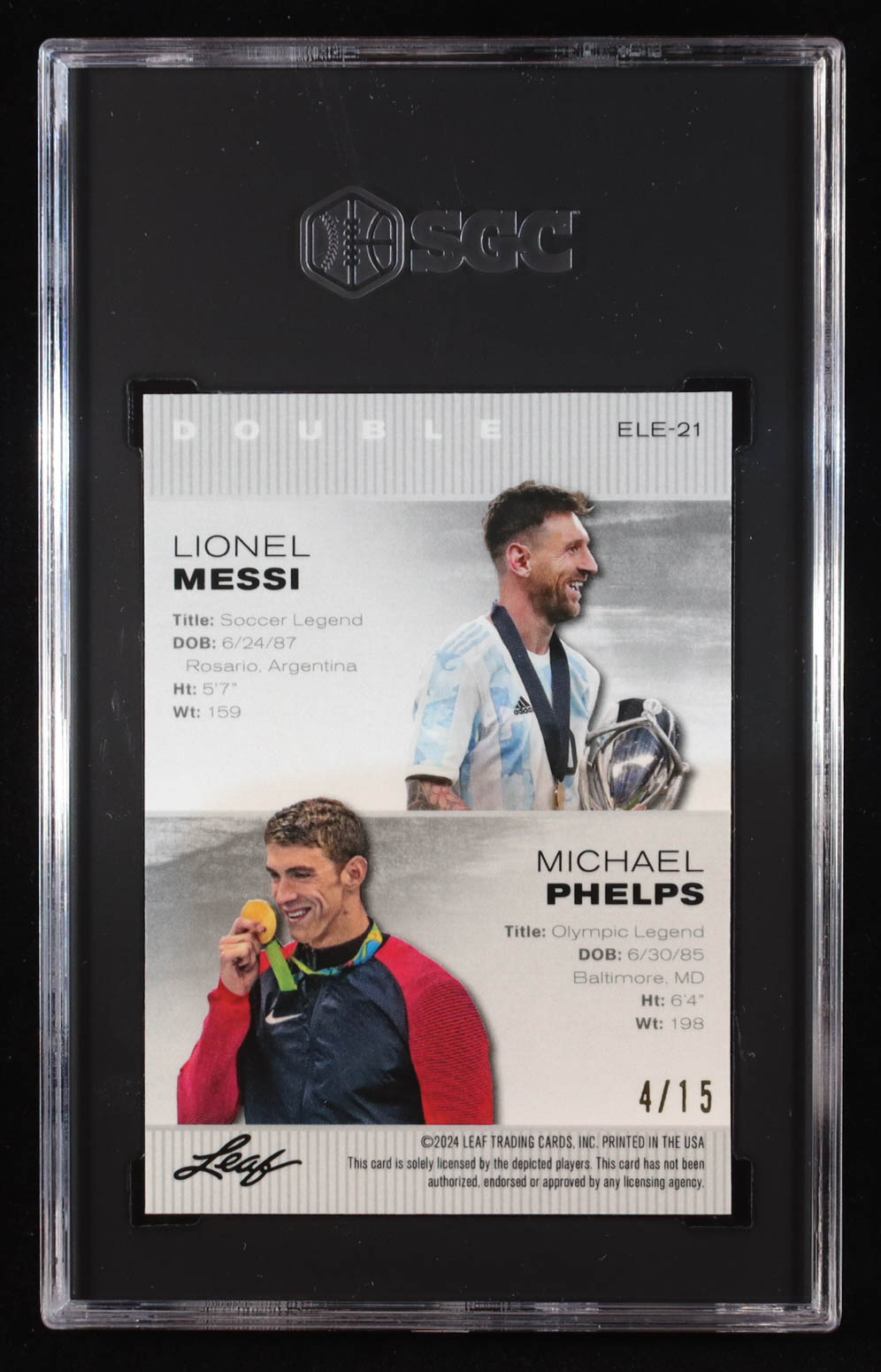 Lionel Messi / Michael Phelps 2024 Leaf Metal Special Release Exclusive Legends Edition Crystal Purple #ELE21 #4/15 (SGC 9.5)