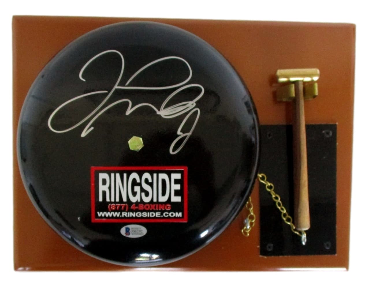 Custom frame measures in size and features a Ringside Boxing Bell with the bell that has been hand-signed in silver paint pen by Floyd Mayweather Jr. Please note, the bell has been attached to a wooden plaque.