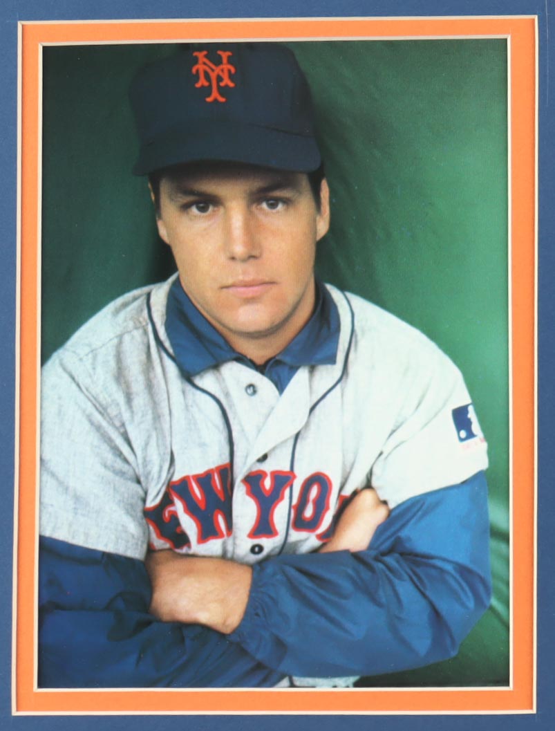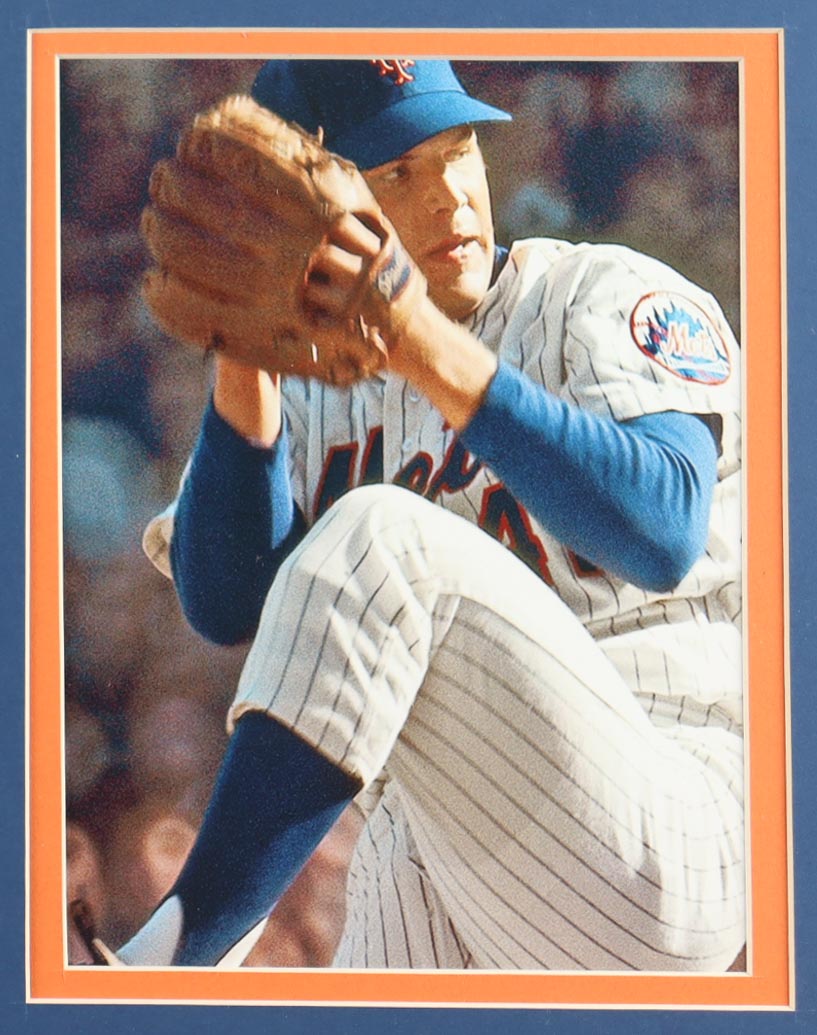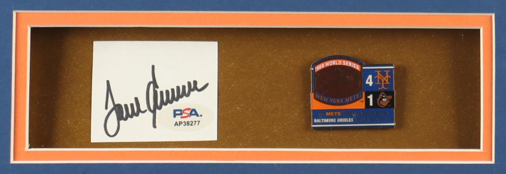 Custom frame measures approximately 35" x 43" in size and features a cut that has been hand-signed by Tom Seaver (HOF). Display also includes a jersey as well as a 1969 World Series Pin.