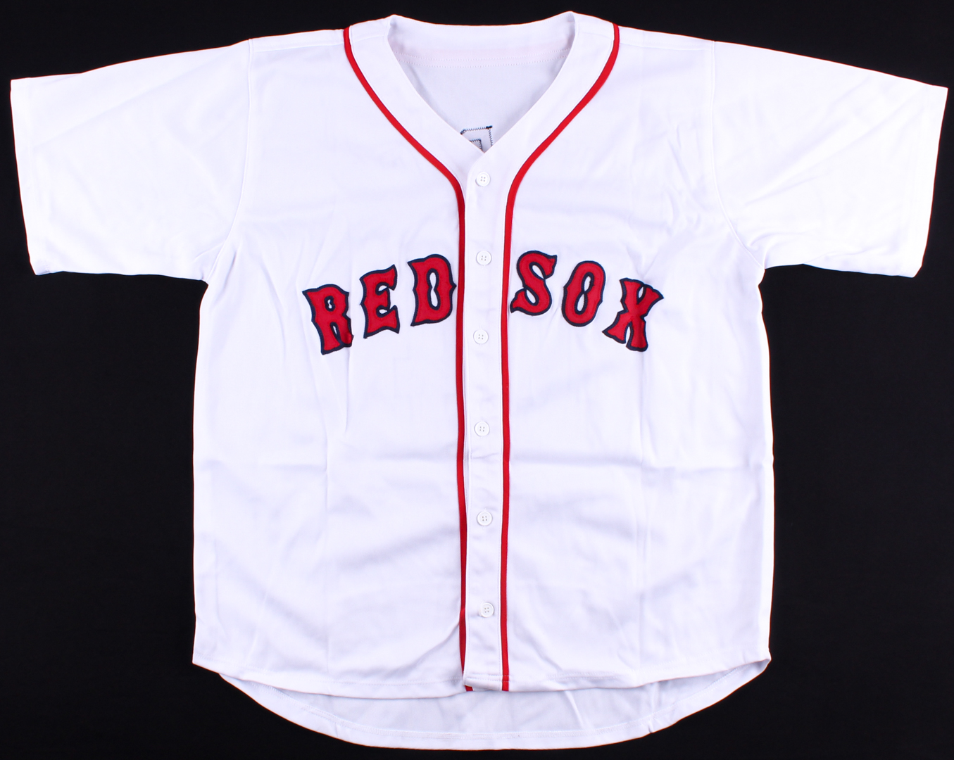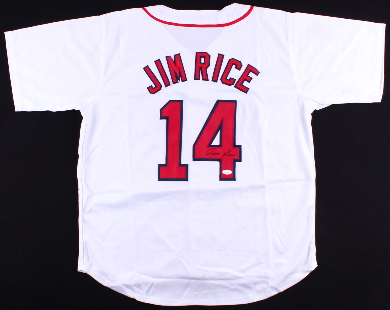 Custom on-field style jersey. Everything sewn on, size XL. Hand-signed in black felt-tip pen by Jim Rice (HOF). Please note, the jersey has slight staining.