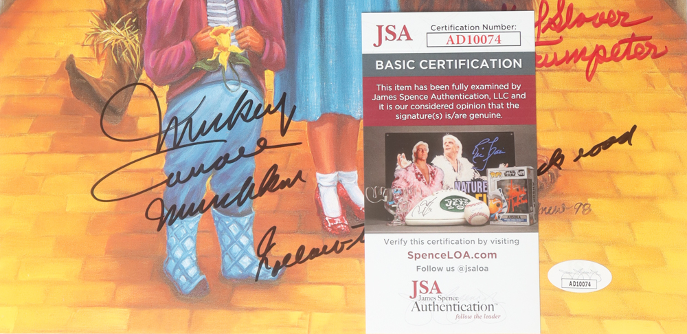 Print measures 11.5" x 14.5" in size and has been hand-signed and inscribed by Jerry Maren (Lollipop Kid) (D. 2018), Mickey Carroll (Munchkin) (D. 2009), and Karl Slover (1st Trumpeter) (D. 2011).