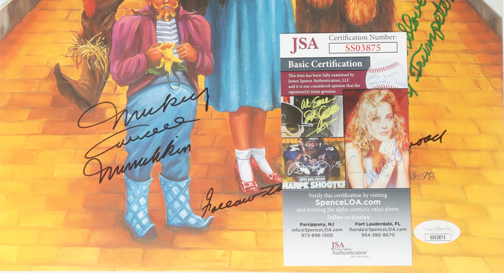 Print measures 11.5" x 14.5" in size and has been hand-signed and inscribed by Jerry Maren (Lollipop Kid) (D. 2018), Mickey Carroll (Munchkin) (D. 2009), and Karl Slover (1st Trumpeter) (D. 2011).
