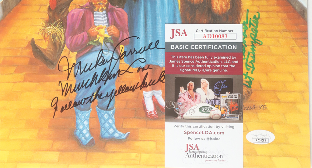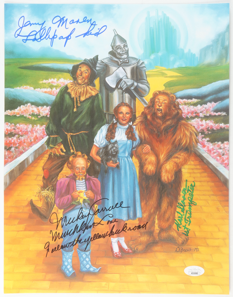 Print measures 11.5" x 14.5" in size and has been hand-signed and inscribed by Jerry Maren (Lollipop Kid) (D. 2018), Mickey Carroll (Munchkin) (D. 2009), and Karl Slover (1st Trumpeter) (D. 2011).