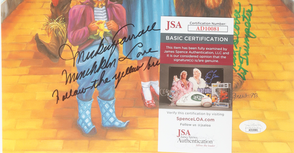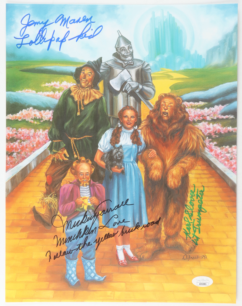 Print measures 11.5" x 14.5" in size and has been hand-signed and inscribed by Jerry Maren (Lollipop Kid) (D. 2018), Mickey Carroll (Munchkin) (D. 2009), and Karl Slover (1st Trumpeter) (D. 2011).