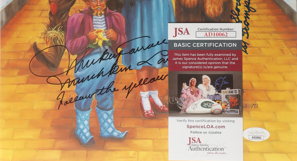 Print measures 11.5" x 14.5" in size and has been hand-signed and inscribed by Jerry Maren (Lollipop Kid) (D. 2018), Mickey Carroll (Munchkin) (D. 2009), and Karl Slover (1st Trumpeter) (D. 2011).