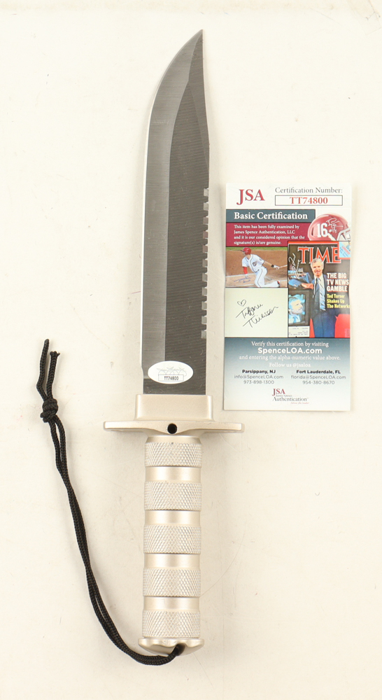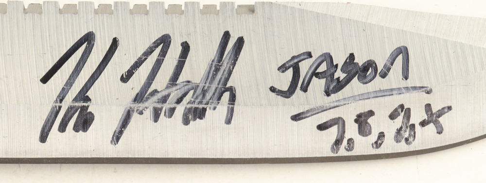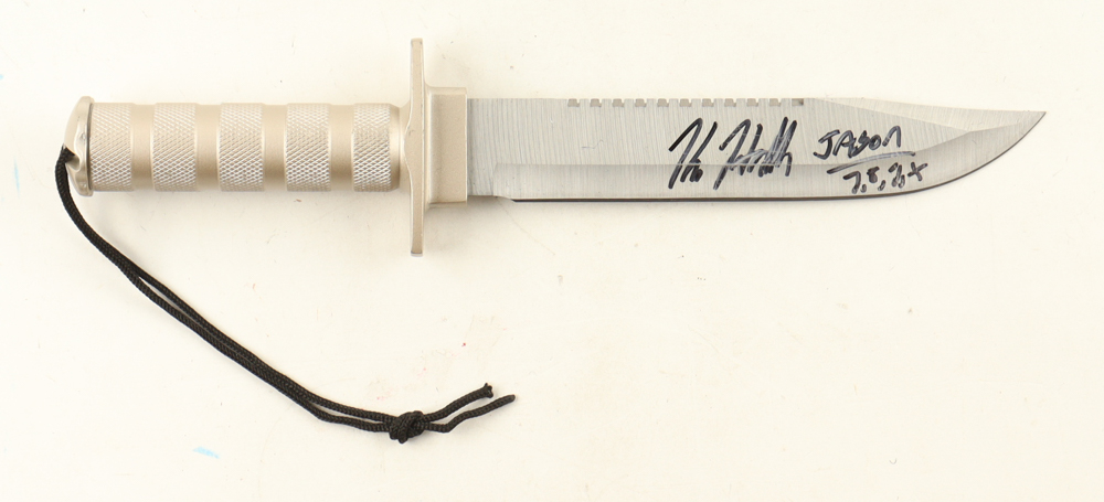 "Friday the 13th" stainless steel hunting knife. Measures approximately 14" in length. Hand-signed and inscribed by Kane Hodder. Please note, knife is sharp and there is some scuffing on the autograph.