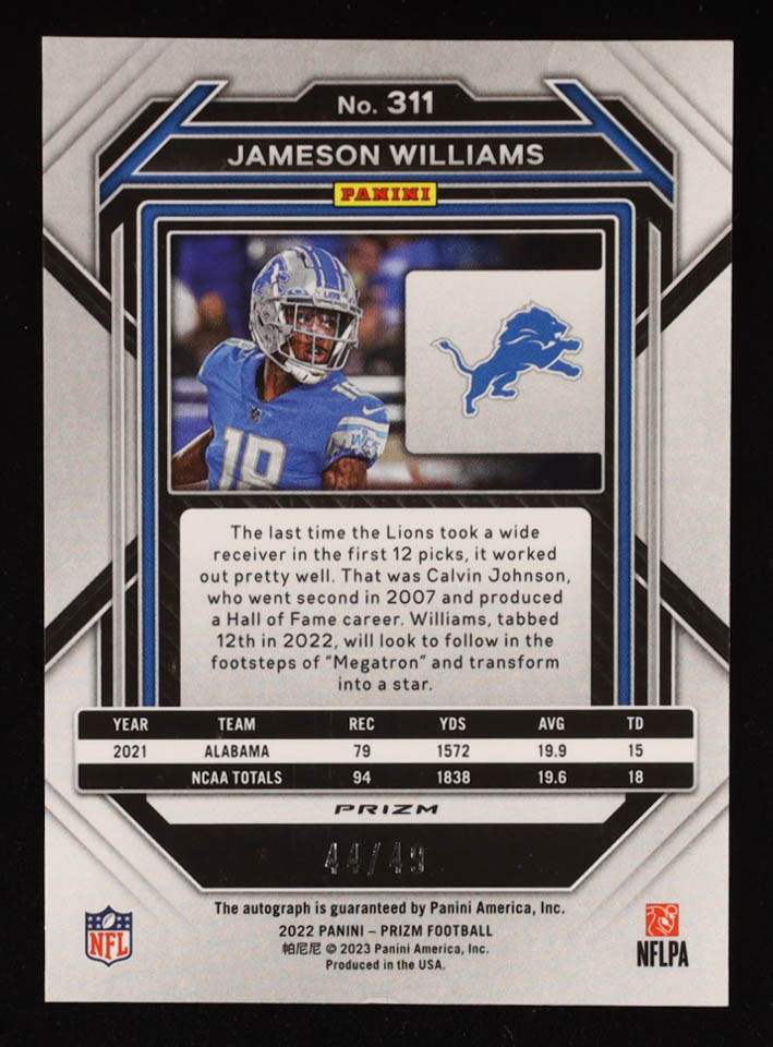Jameson Williams 2022 Panini Prizm Autographs Prizms Purple Power #311 RC #44/49