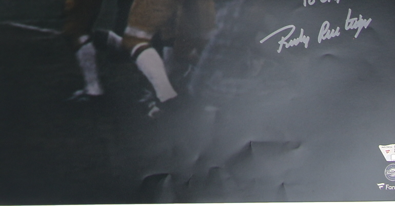 Photo measures 16” x 20” in size and has been hand-signed and inscribed by Rudy Ruettiger. Please note, the bottom of the photo is creased.