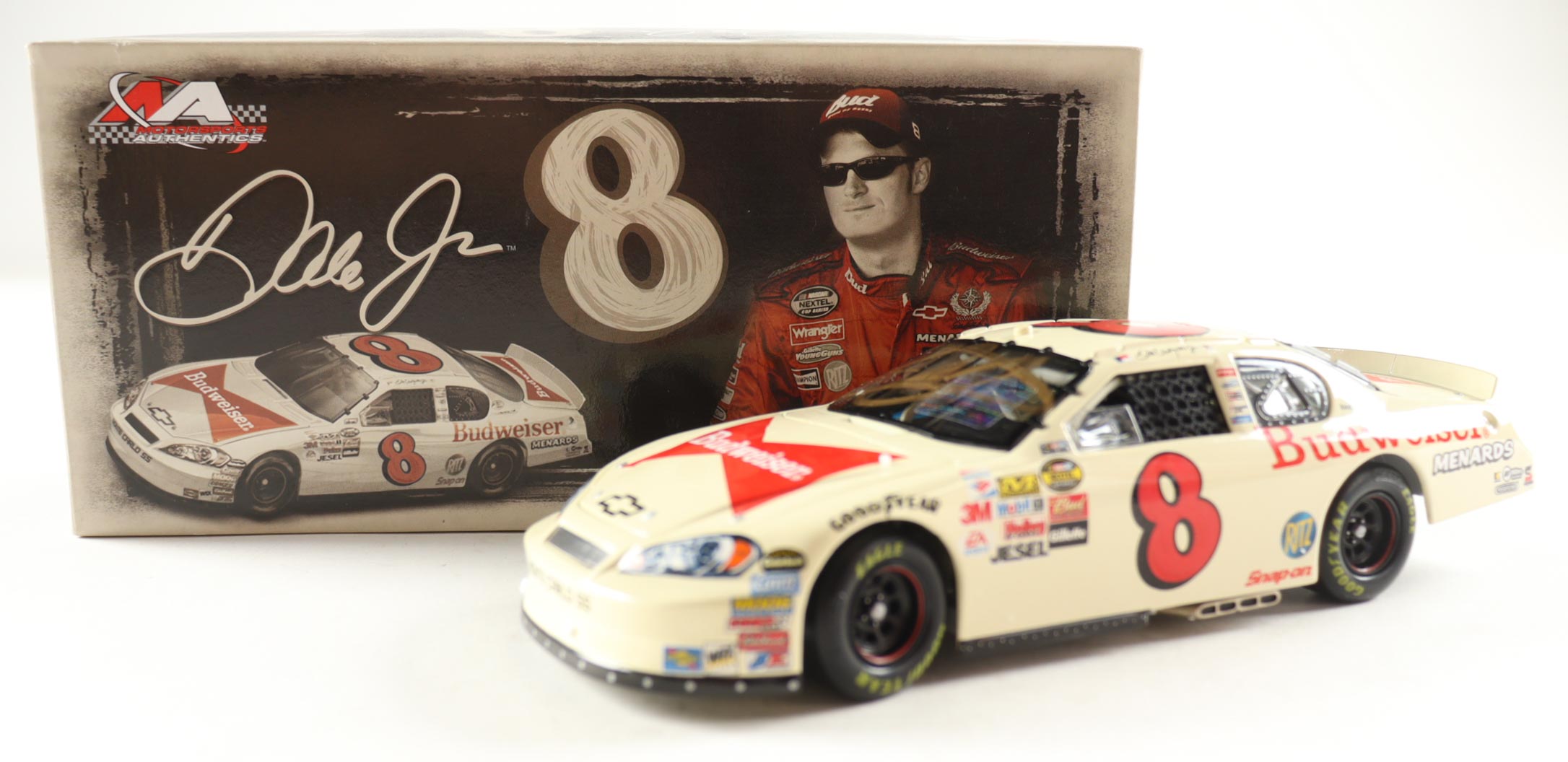 NASCAR premium die-cast car has been hand-signed on the windshield by Dale Earnhardt Jr.