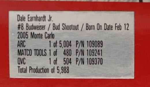 Dale Earnhardt Jr. Signed 2005 #8 Budweiser / Bud Shootout / Born On Date Feb 12 Monte Carlo 1:24 Diecast Car (JR Motorsports)