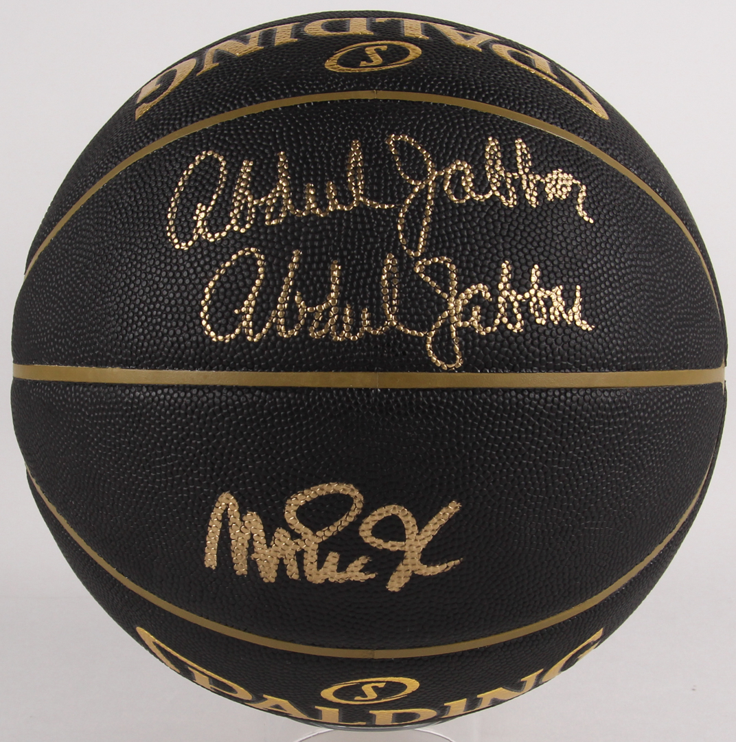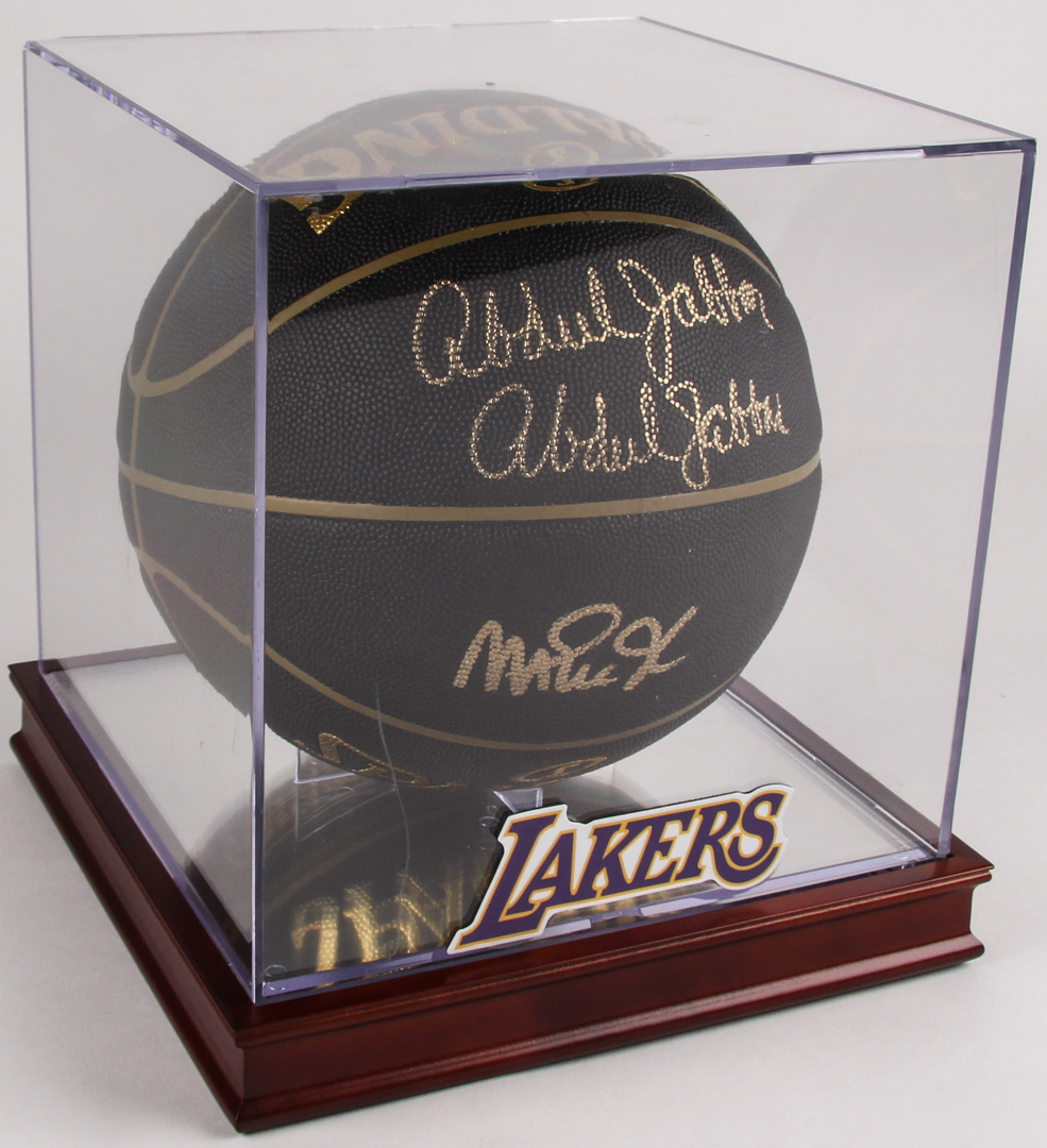 Spalding NBA Elevation Extreme Basketball. Hand-signed in gold paint pen by Magic Johnson (Lakers, HOF) and Kareem Abdul-Jabbar (Lakers, HOF). Auction includes display case shown. Please note, Kareem Abdul-Jabbar has signed the ball twice and there is a crack in one of the top corners of the display case.