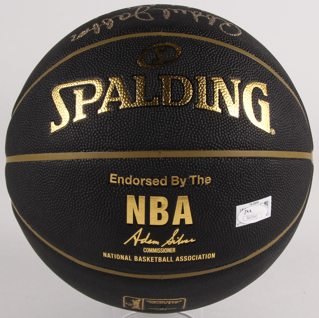 Kareem Abdul-Jabbar & Magic Johnson Signed Spalding NBA Basketball with Display Case (JSA COA)