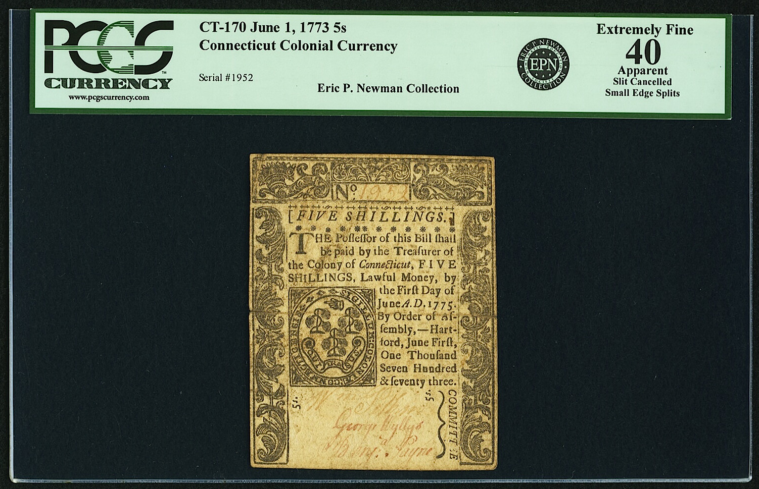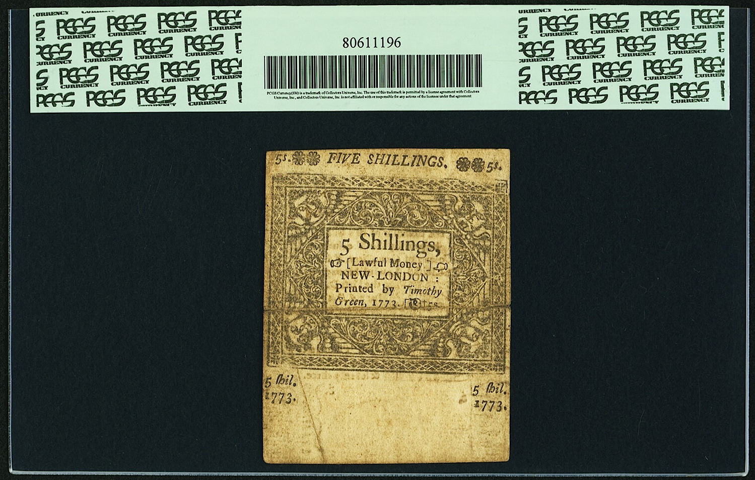 1773 Five Shillings Connecticut Colonial Currency Bank Note Bill (CT-170) (PCGS 40)