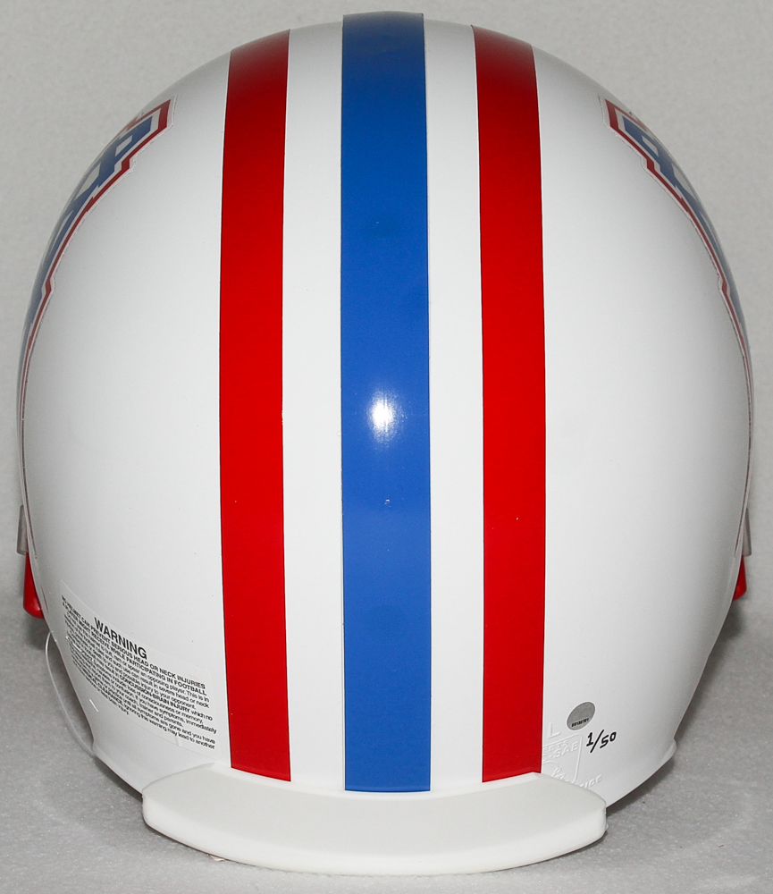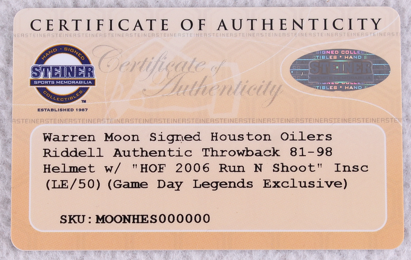 Riddell full-size authentic proline helmet. Hand-signed and inscribed in black felt-tip pen by Warren Moon (HOF). Helmet is limited edition and has been hand-numbered out of /50.