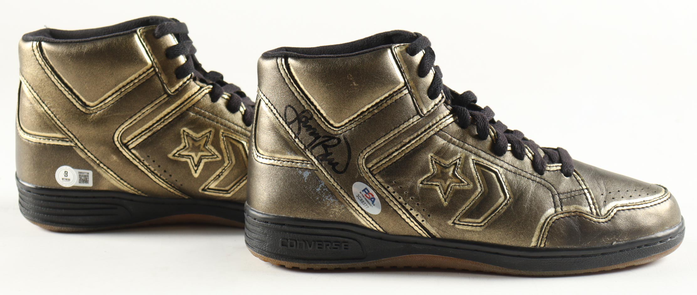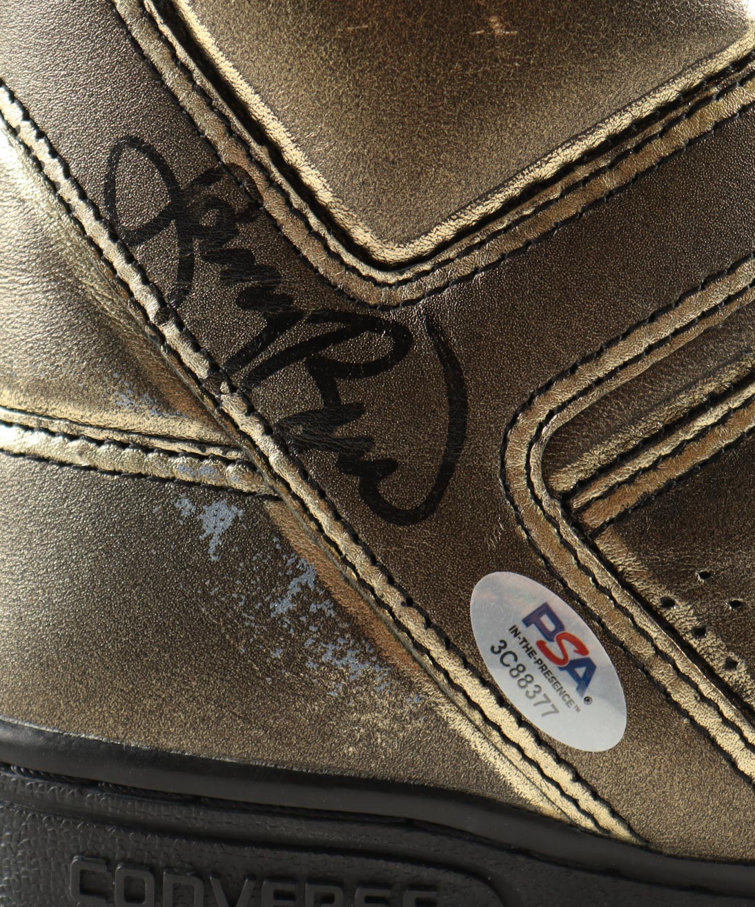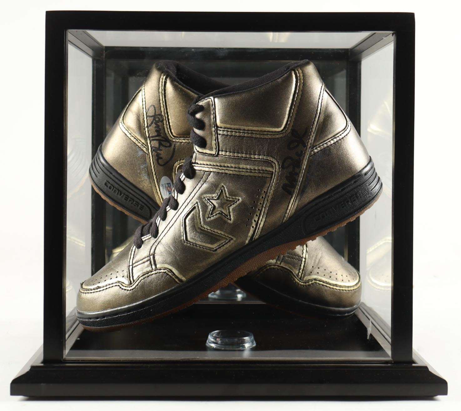 Magic Johnson & Larry Bird Signed Set of (2) Converse All Star Gold Leather Basketball Shoes with Display Case (PSA)