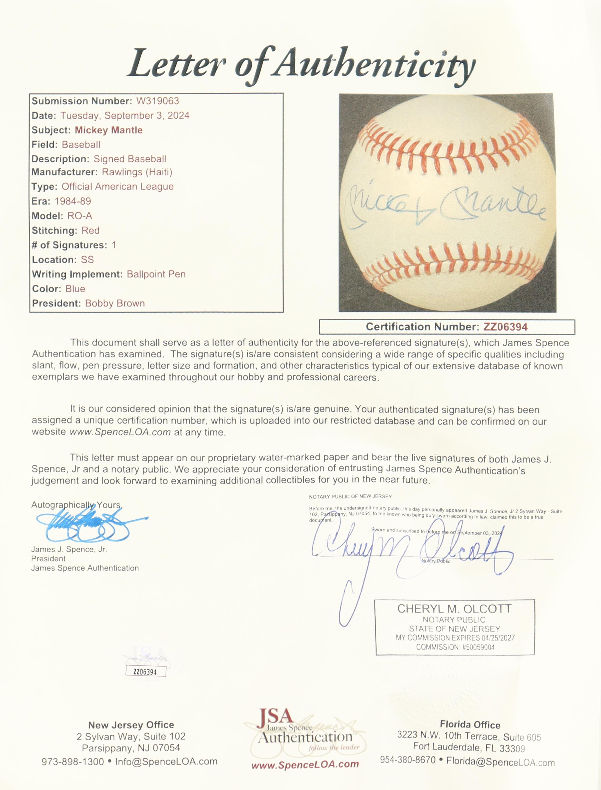 Mickey Mantle Signed OAL Baseball (JSA)