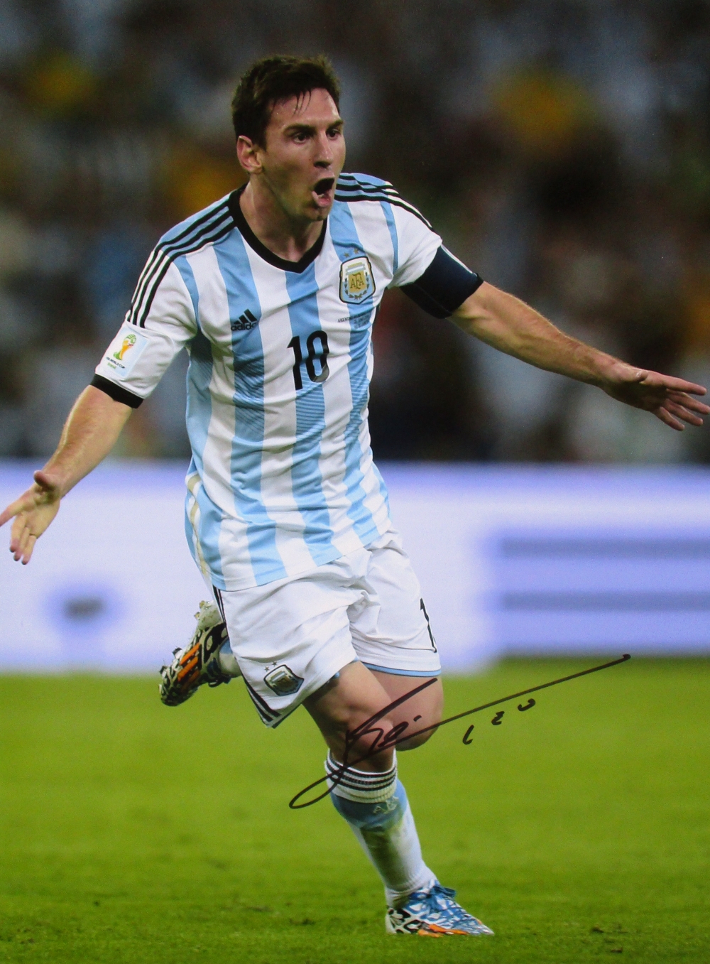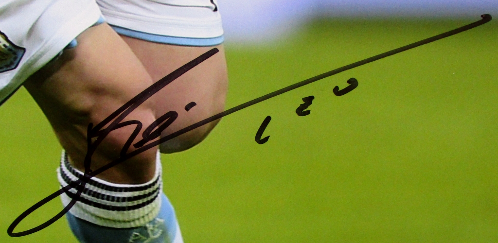 Photo measures 12" x 16" in size and is hand-signed in black felt-tip pen by Lionel Messi.