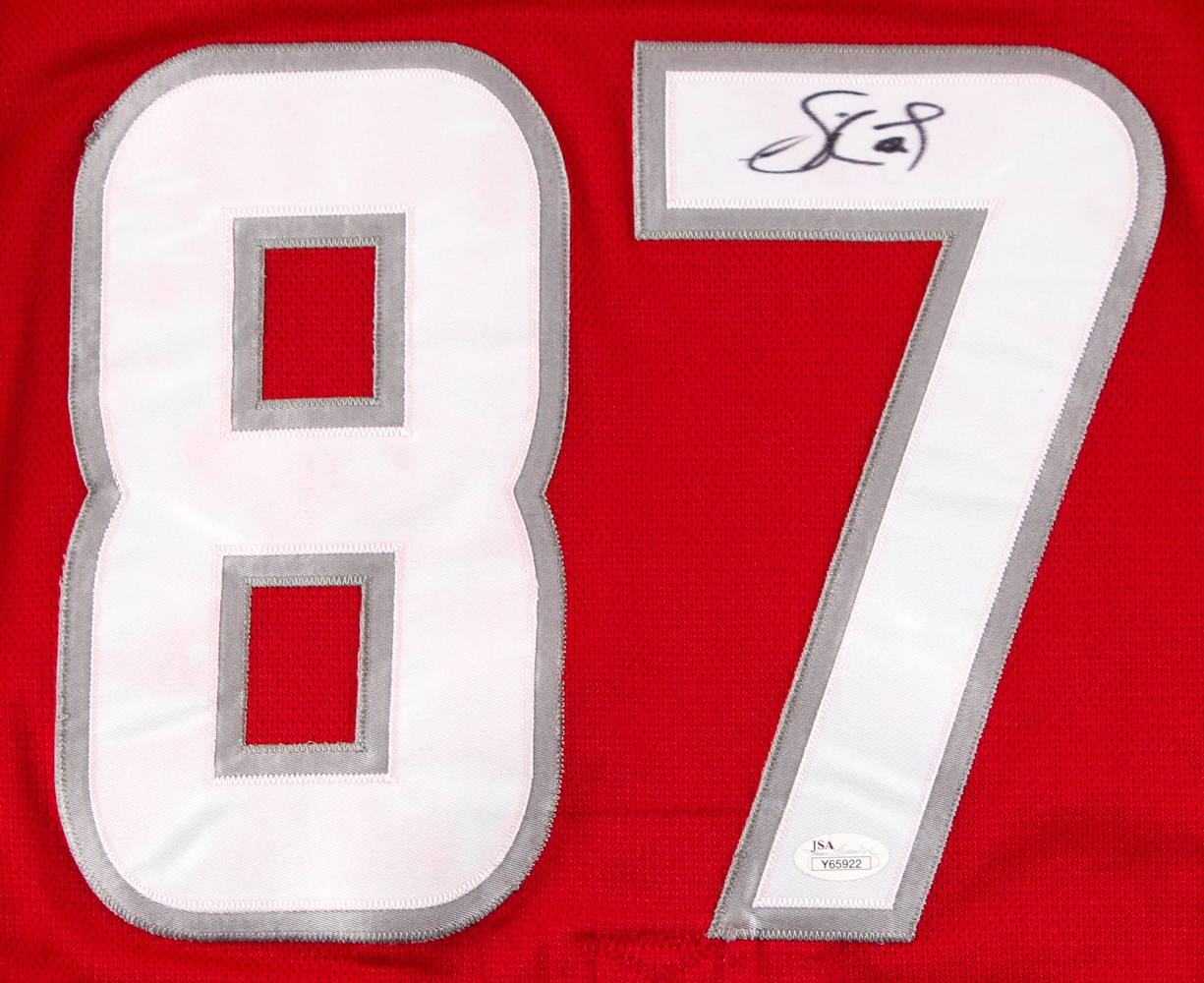 Reebok on-field style jersey. Everything is sewn on, size 54. Hand-signed in black felt-tip pen by Sidney Crosby (Penguins).