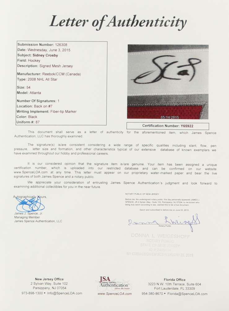 Sidney Crosby Signed 2008 NHL All Star Jersey (JSA LOA)