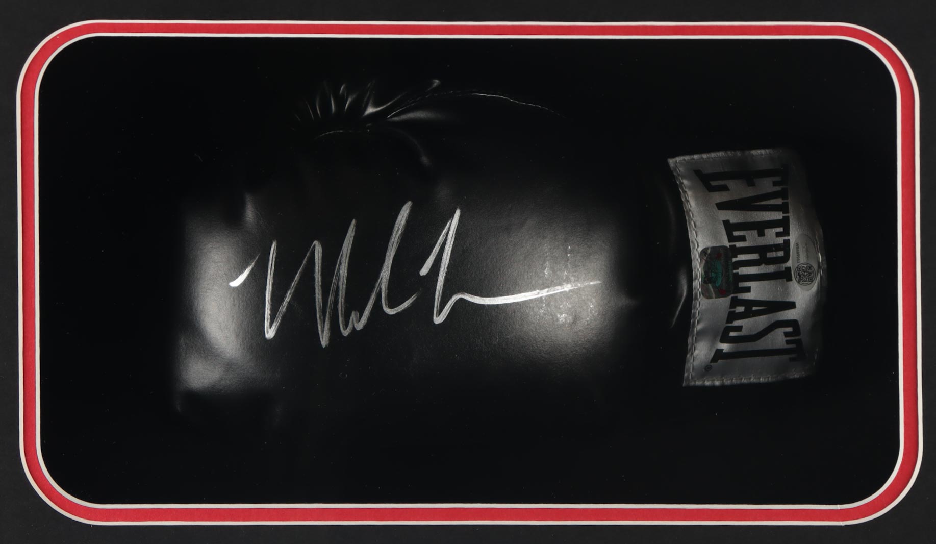 Shadowbox measures approximately 22.5" x 26.5" x 6.5" in size and features an Everlast boxing glove that has been hand-signed by Mike Tyson (HOF). Please note, there is scuffing on the display and the autograph as well as residue on the bottom border.