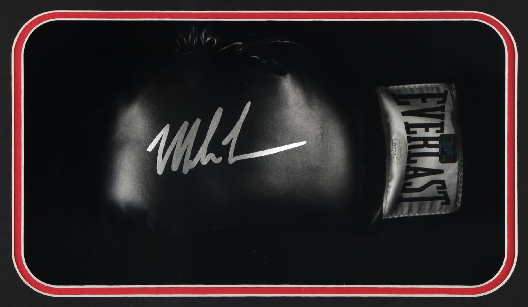 Shadowbox measures approximately 22.5" x 26.5" x 6.5" in size and features an Everlast boxing glove that has been hand-signed by Mike Tyson (HOF). Please note, there is scuffing on the display and the autograph as well as residue on the bottom border.