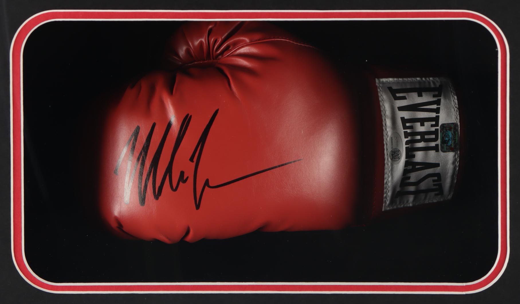 Shadowbox measures approximately 22.5" x 26.5" x 6.5" in size and features an Everlast boxing glove that has been hand-signed by Mike Tyson (HOF). Please note, there is scuffing on the display and the autograph as well as residue on the bottom border.