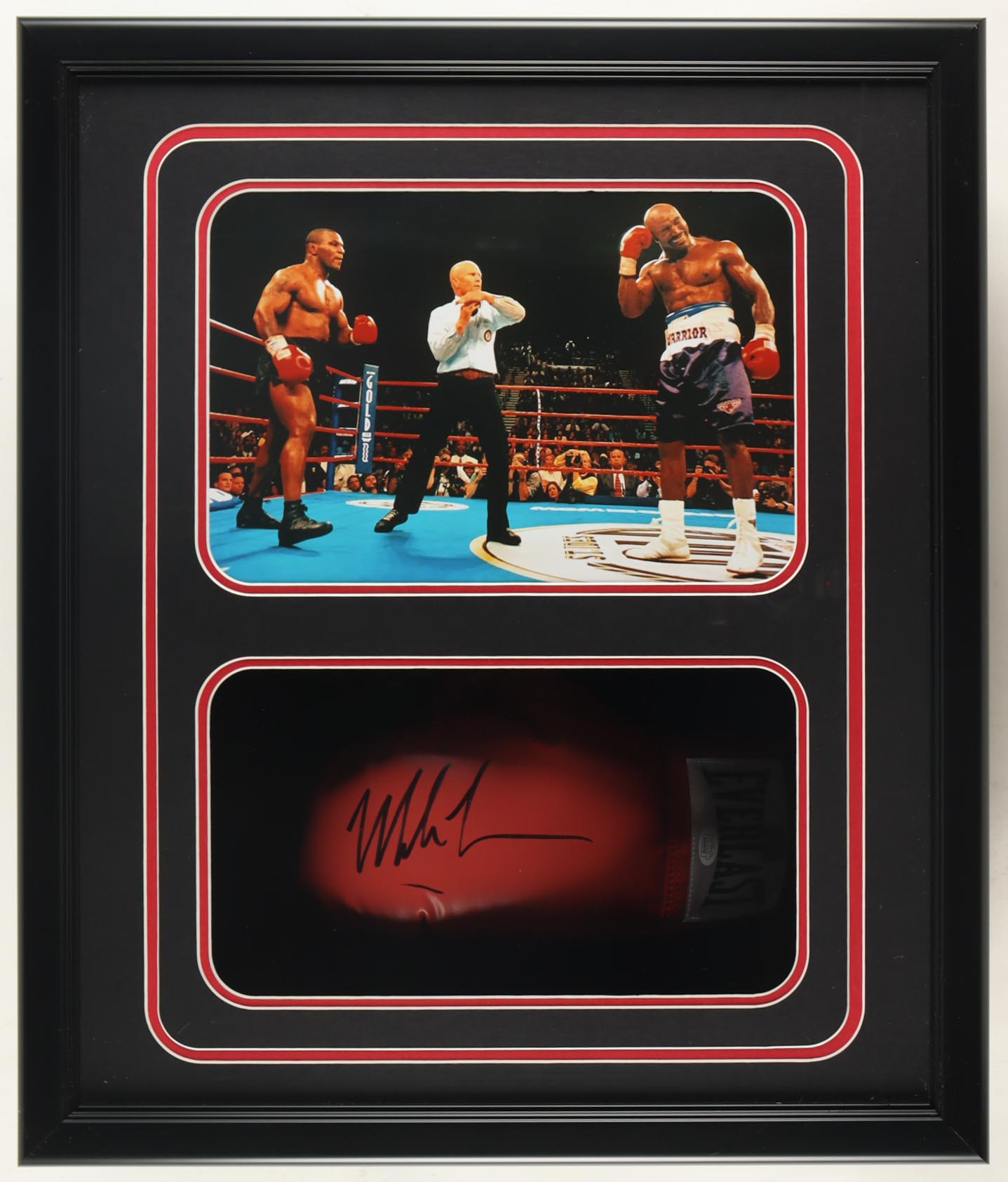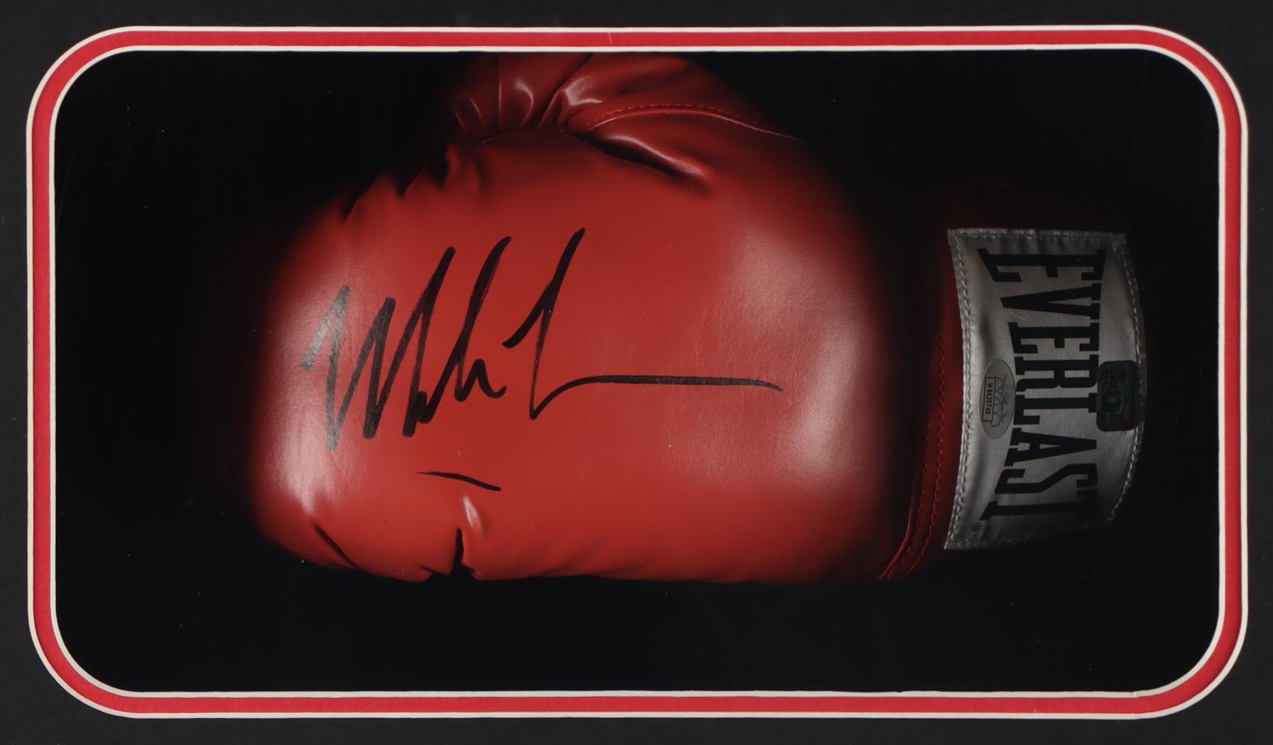 Shadowbox measures approximately 22.5" x 26.5" x 6.5" in size and features an Everlast boxing glove that has been hand-signed by Mike Tyson (HOF). Please note, there is scuffing on the display and the autograph as well as residue on the bottom border.