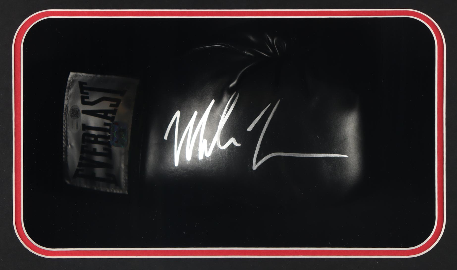 Shadowbox measures approximately 22.5" x 26.5" x 6.5" in size and features an Everlast boxing glove that has been hand-signed by Mike Tyson (HOF).