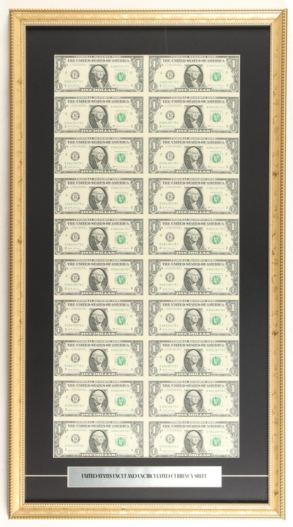Uncut Uncirculated Sheet of (20) 2017 US Dollar Bills Custom Framed Display