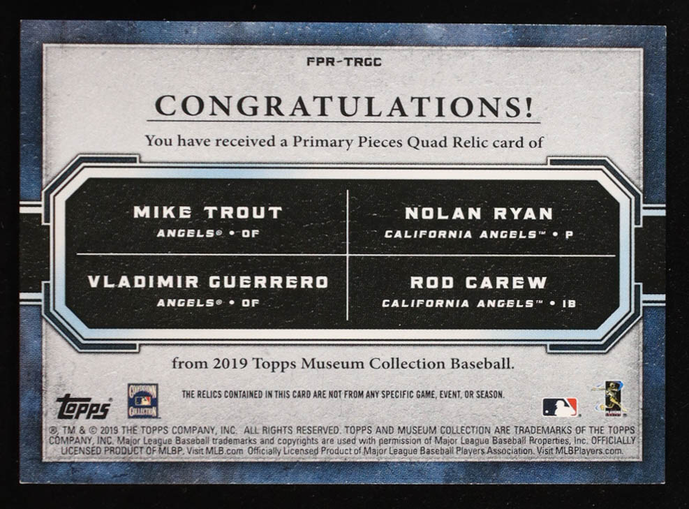 Nolan Ryan / Mike Trout / Vladimir Guerrero / Rod Carew 2019 Topps Museum Collection Primary Pieces Four Player Quad Relics #FPRTRGC #38/99