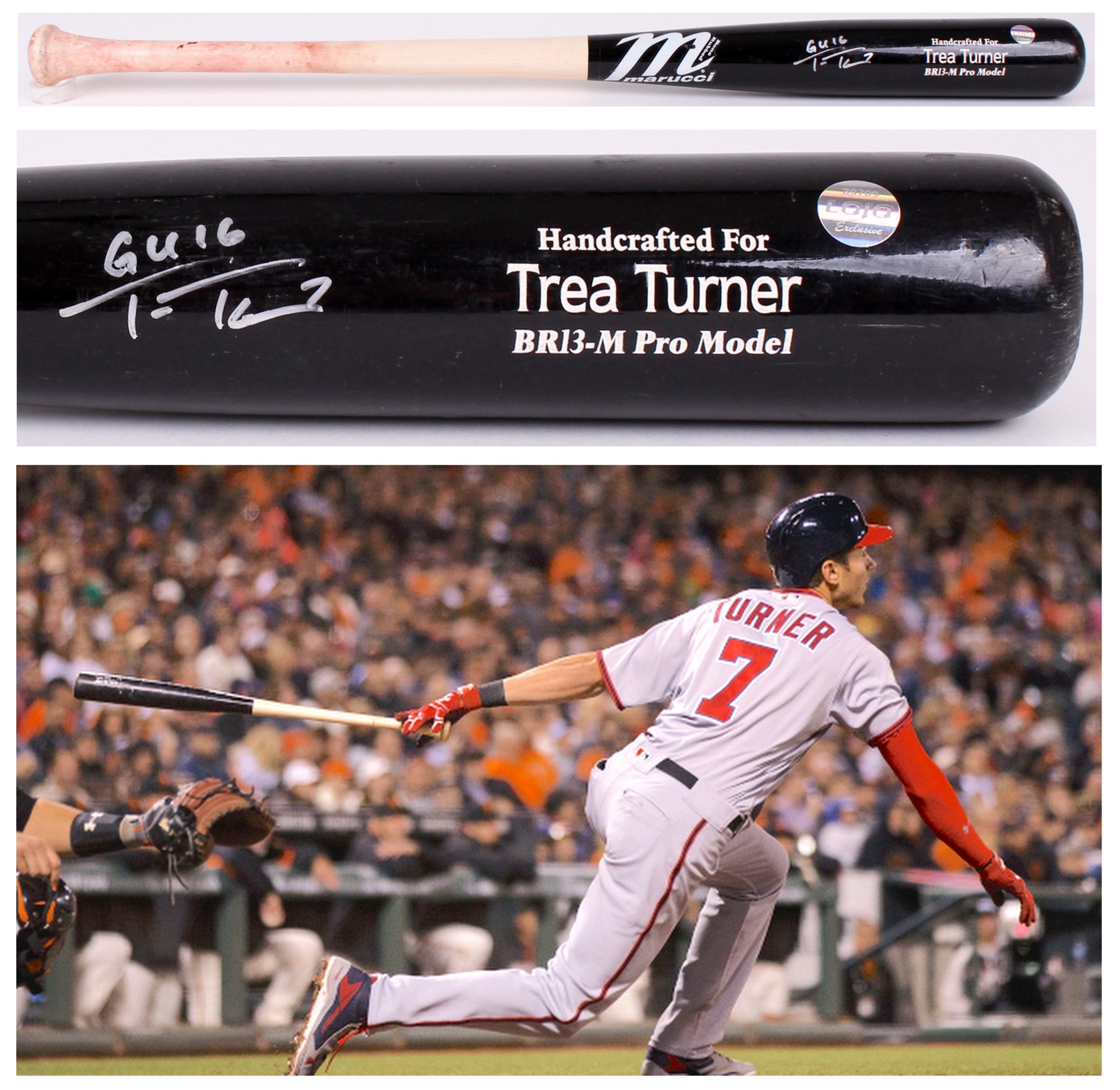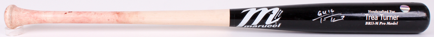 Marucci model BR13-M baseball bat, game-used during Trea Turner's 2016 rookie season with the Washington Nationals. The bat is hand-signed and inscribed "GU 16" (game-used 2016) in silver paint pen by Turner. The bat shows heavy use and remains un-cracked.
