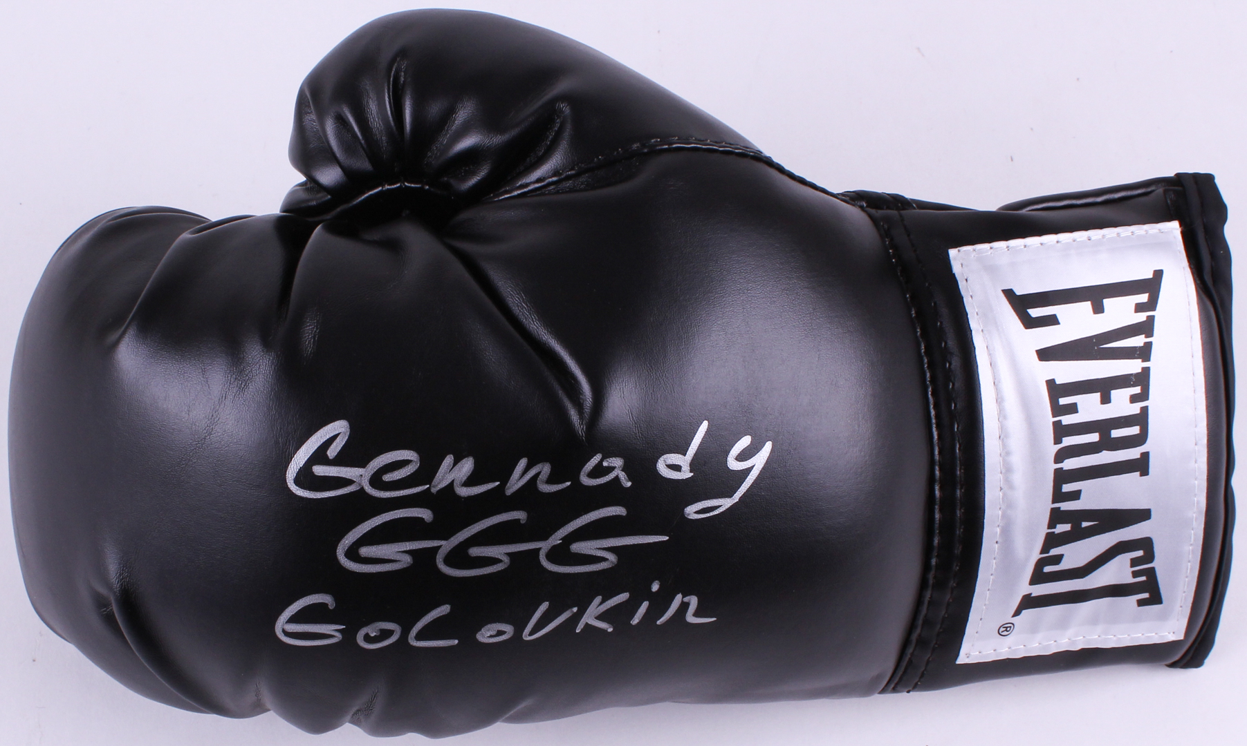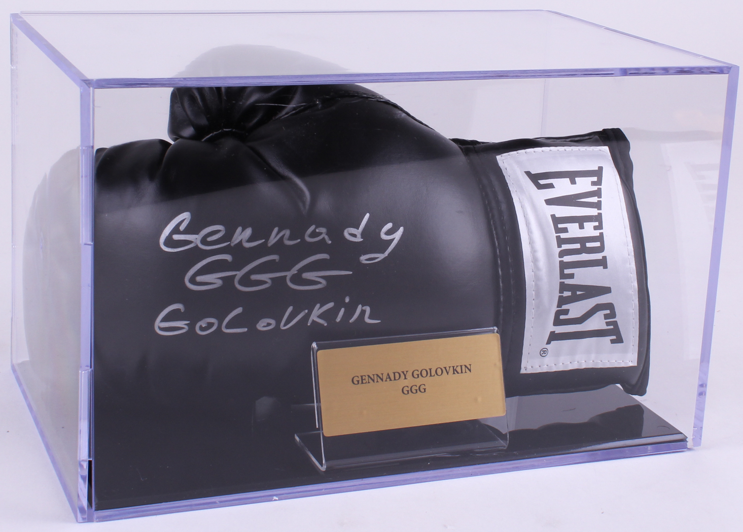 Everlast boxing glove has been hand-signed and inscribed in black felt-tip pen by Gennady Golovkin. The glove comes in the display case as shown.