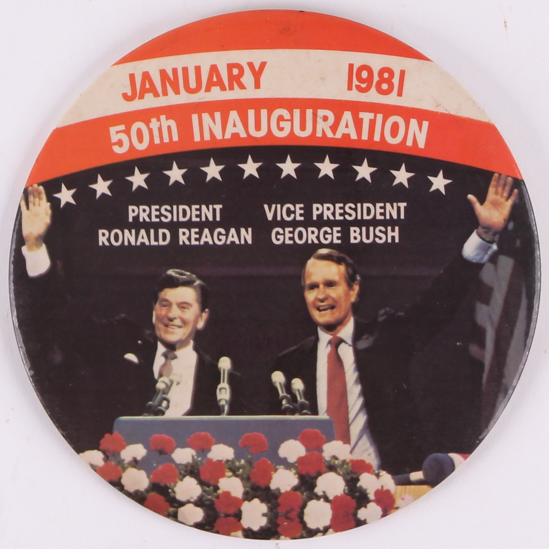 Vintage 1981 Ronald Reagan Large Stand-Up Inauguration Pin.