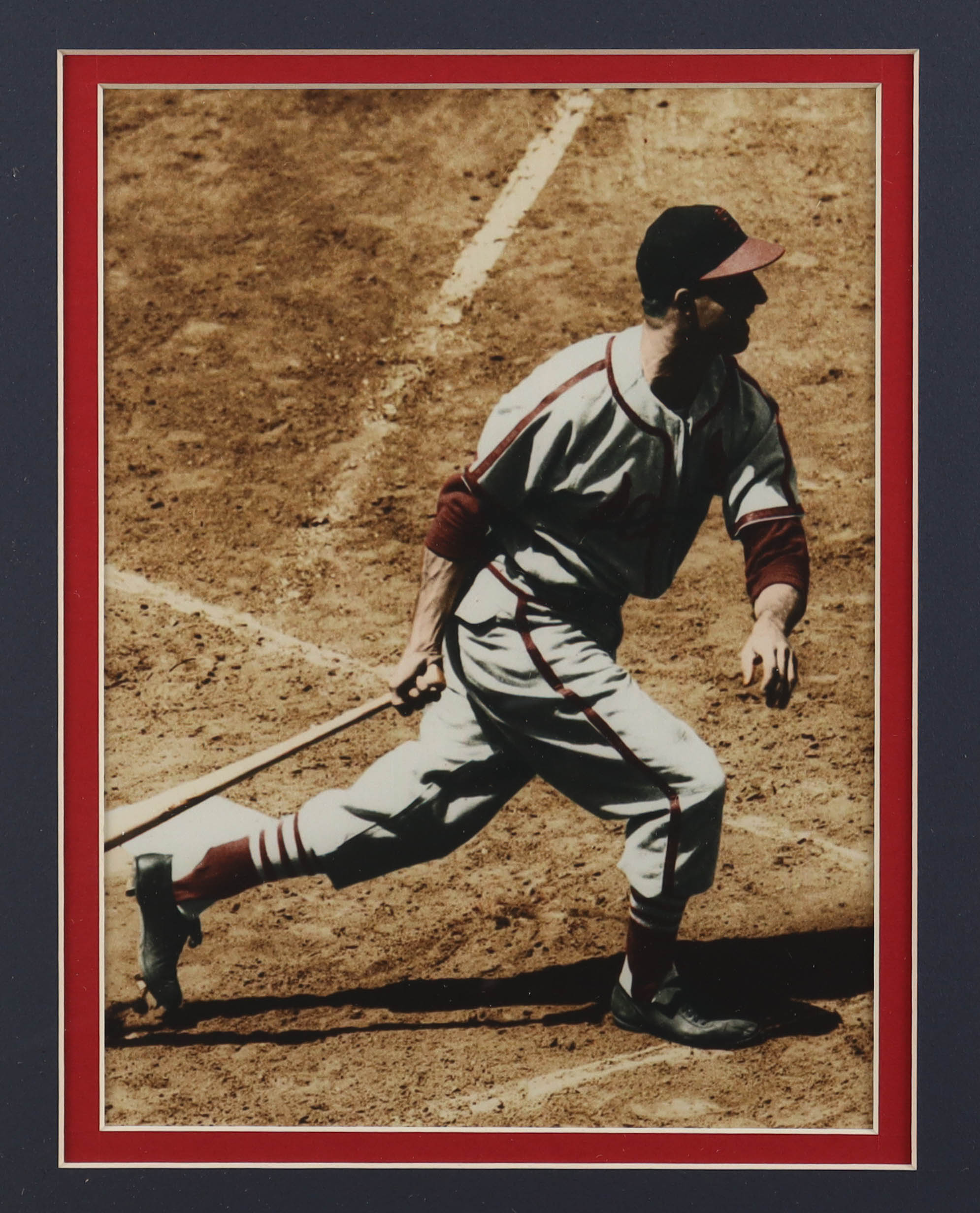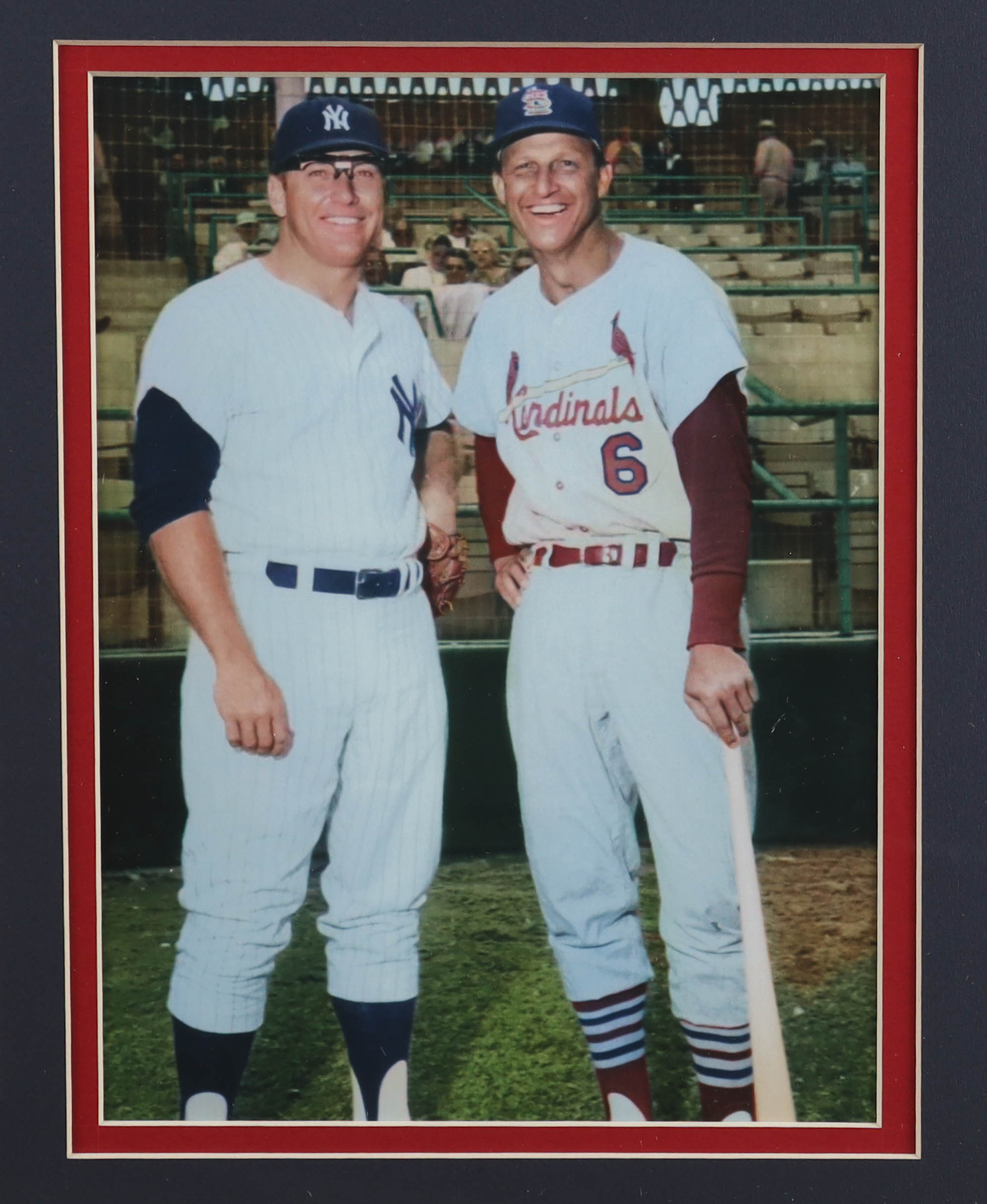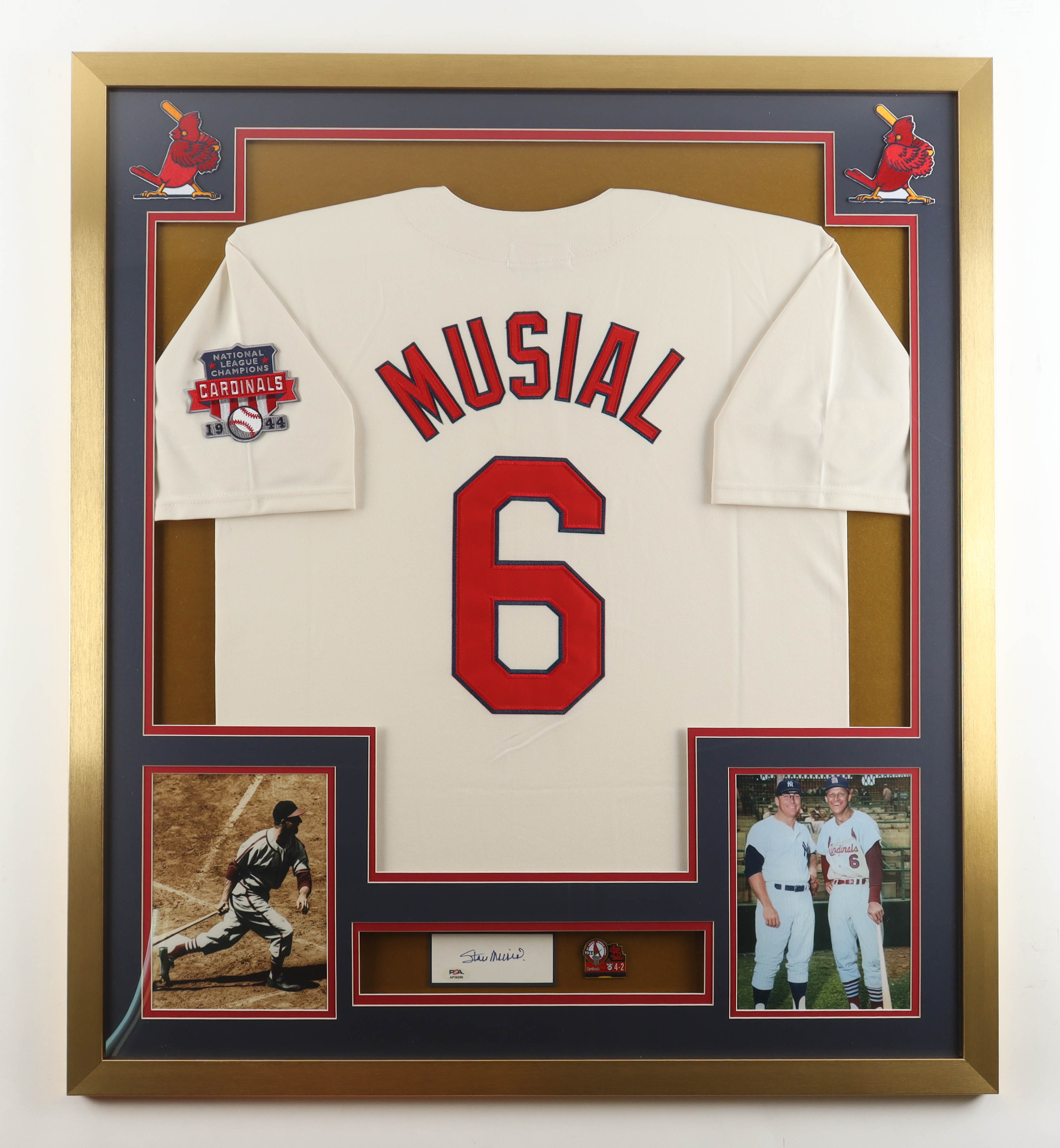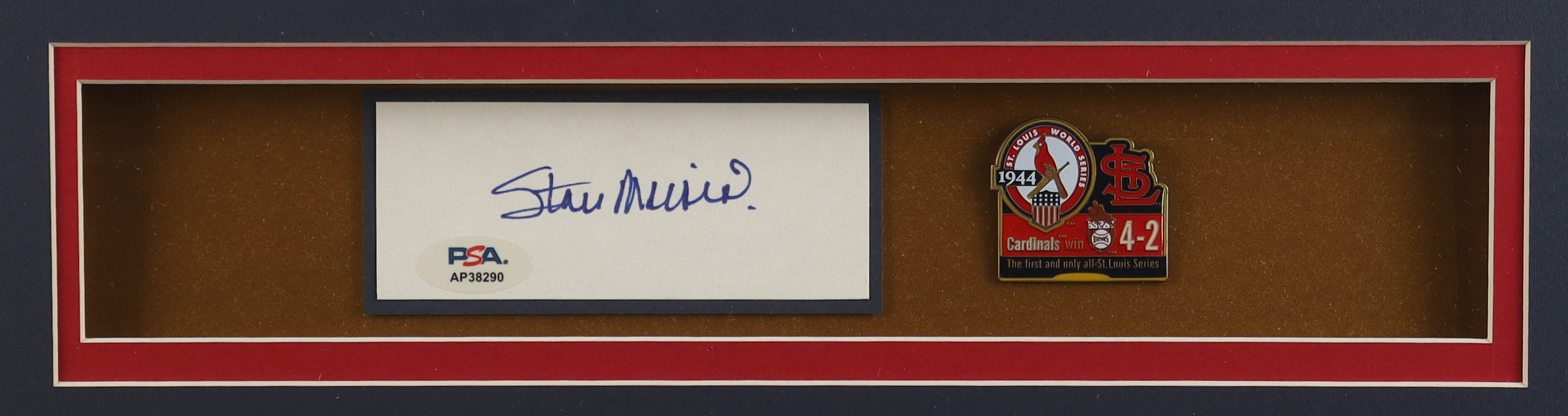 Custom frame measures 32" x 36" in size. Features a cut that has been hand-signed by Stan Musial (St. Louis Cardinals, HOF). Display includes an Official 1944 World Series Pin, (2) 8" x 10" photos & (2) Cardinals Logo Patches.