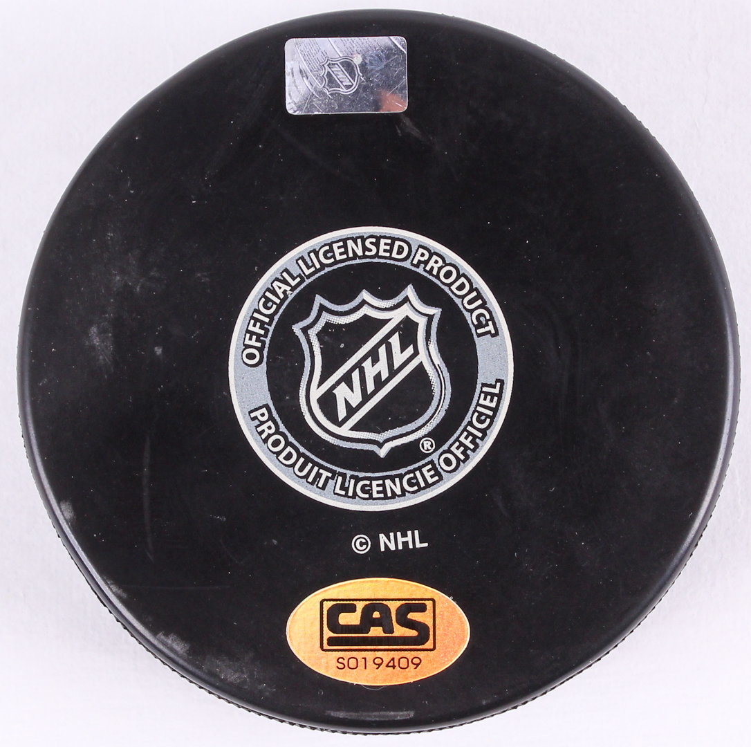 Official NHL logo hockey puck hand-signed in silver paint pen by Darren McCarty.