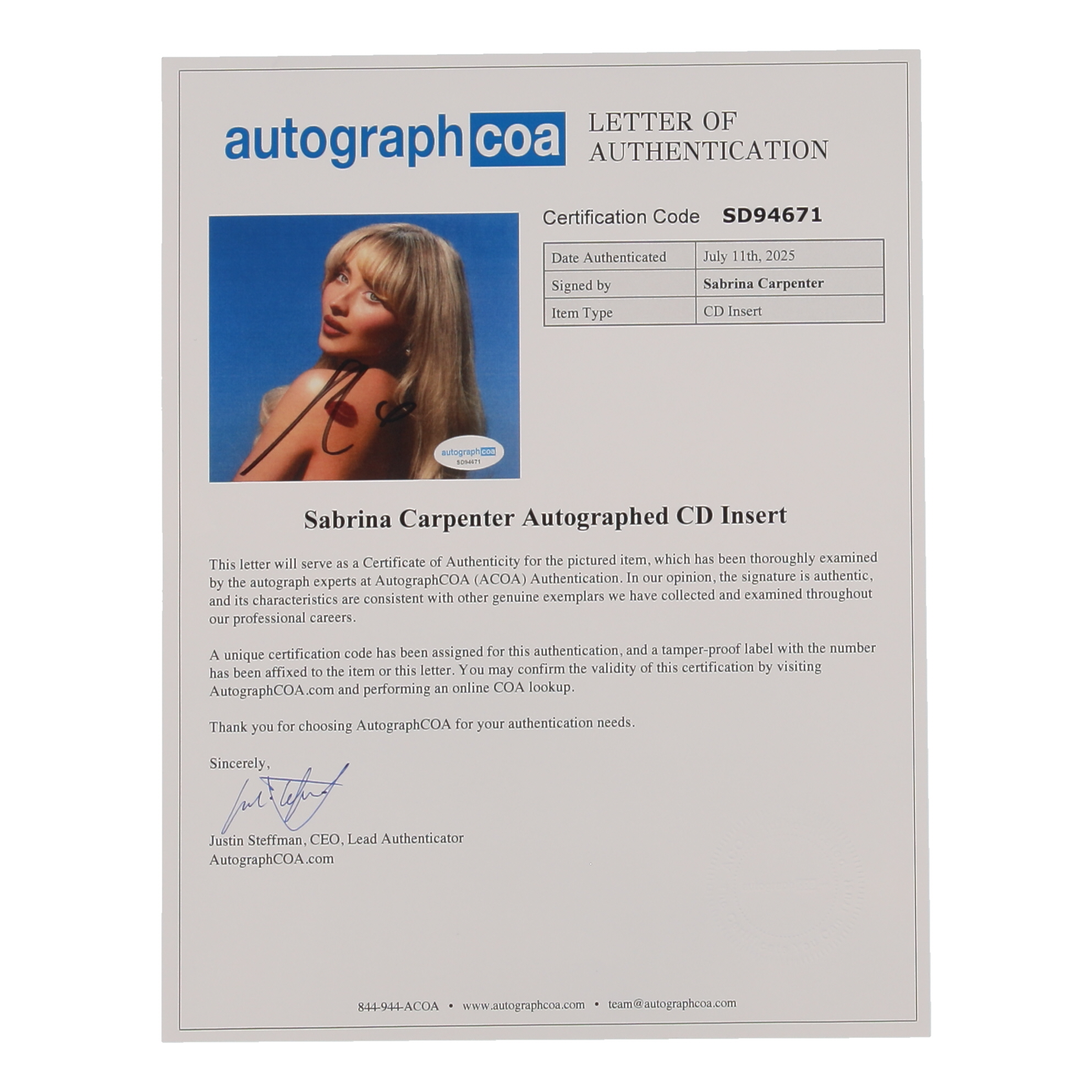 Sabrina Carpenter Signed “Short n' Sweet” CD Insert Lithograph Display with CD & 8x10 Photo (ACOA)