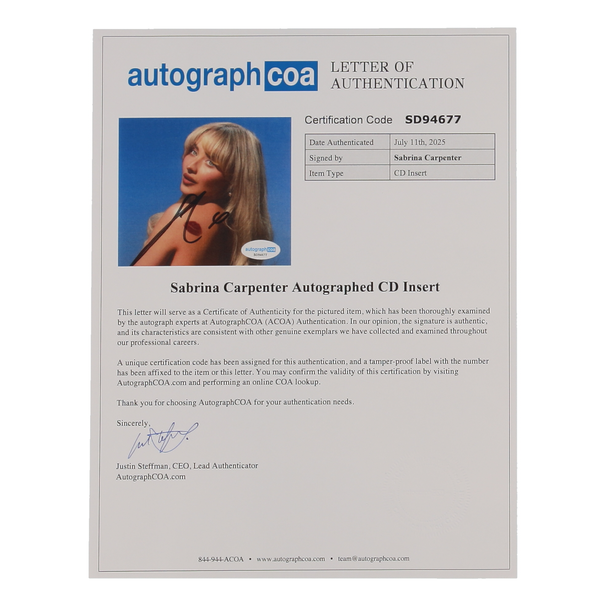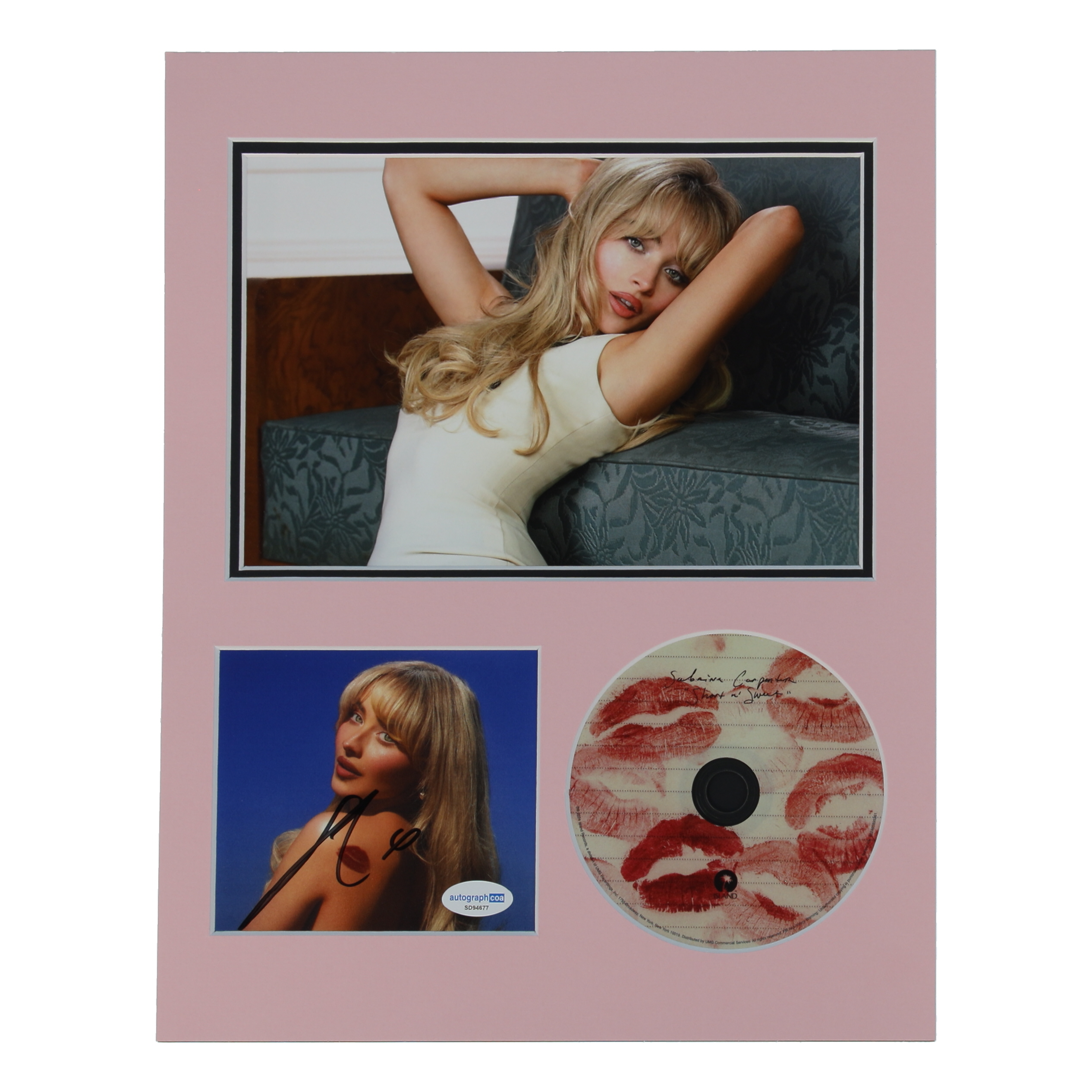 Sabrina Carpenter Signed “Short n' Sweet” CD Insert Lithograph Display with CD & 8x10 Photo (ACOA)