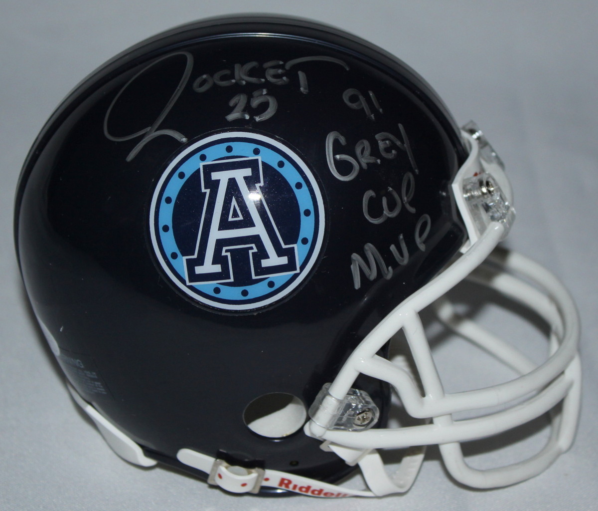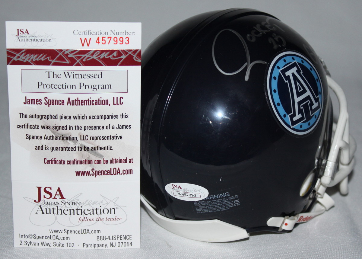 Riddell CFL Toronto Argonauts mini-helmet hand-signed and inscribed in silver paint pen by Raghib "Rocket" Ismail. Autograph includes an official James Spence Authentication hologram and matching COA for authenticity purposes. The signing was witnessed by JSA.