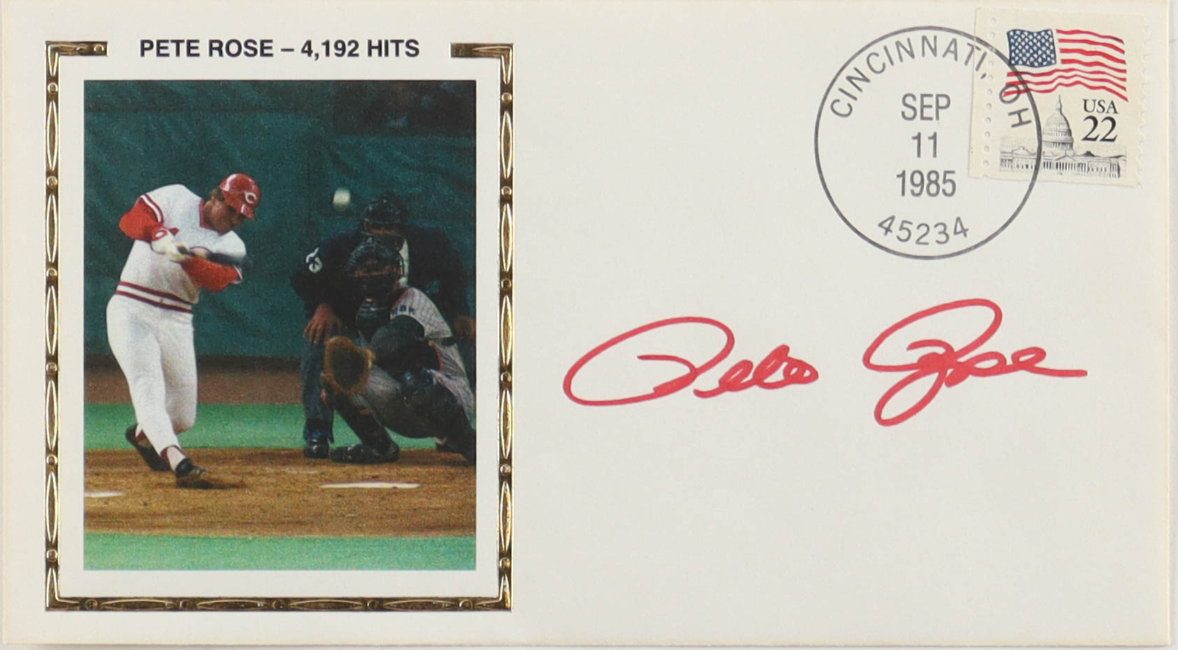 First Day Cover Envelope postmarked September 11, 1985. Hand-signed by Pete Rose (D. 2024, Cincinnati Reds). Please note, there is discoloration on the edges of the envelope.