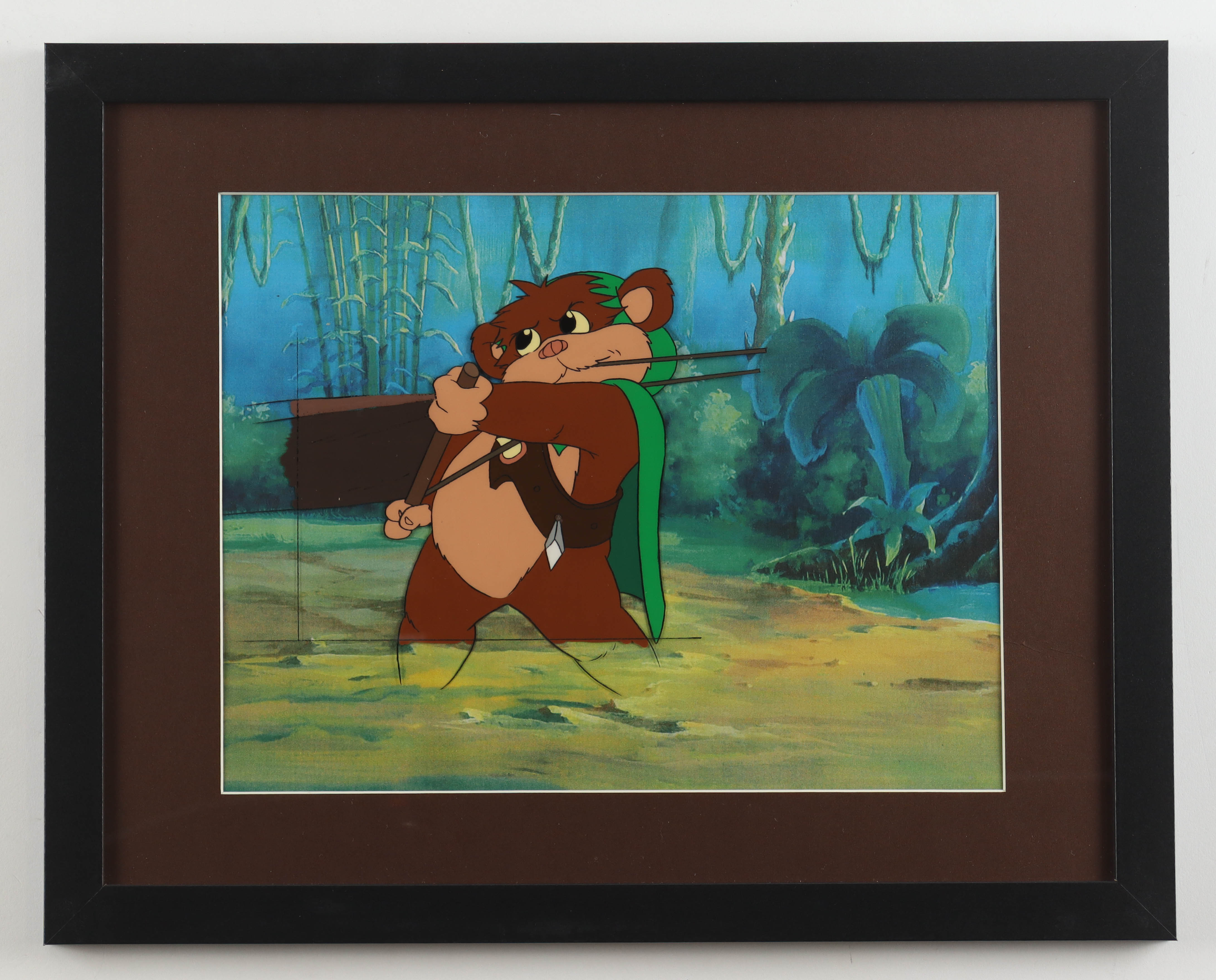 Custom frame measures 12" x 15" in size and features a 1985 Lucas Films "Star Wars: Ewoks" animation cel.