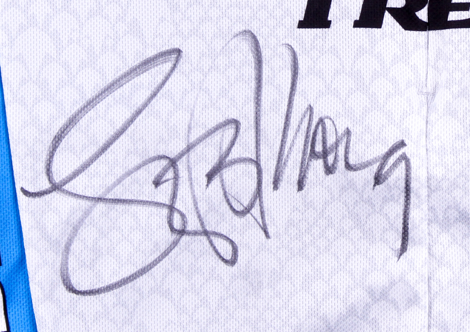 Nike Discovery Channel Cycling style jersey size L. Hand-signed and inscribed in black felt tip pen by Lance Armstrong.