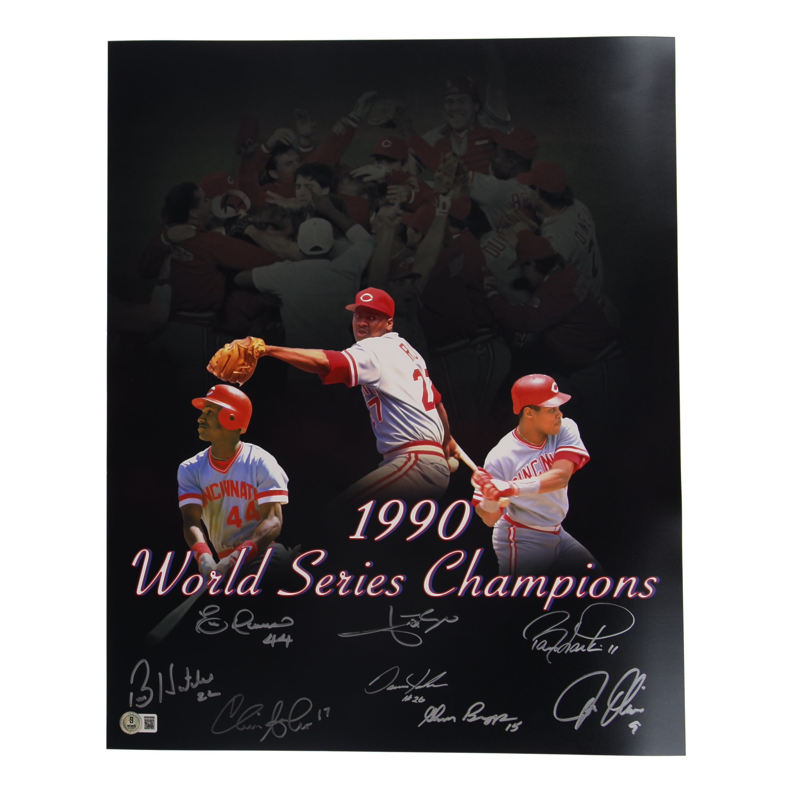 1990 Reds World Series Champions 16x20 Photo Signed By (8) with Barry Larkin, Jose Rijo, Chris Sabo, Eric Davis (Beckett)