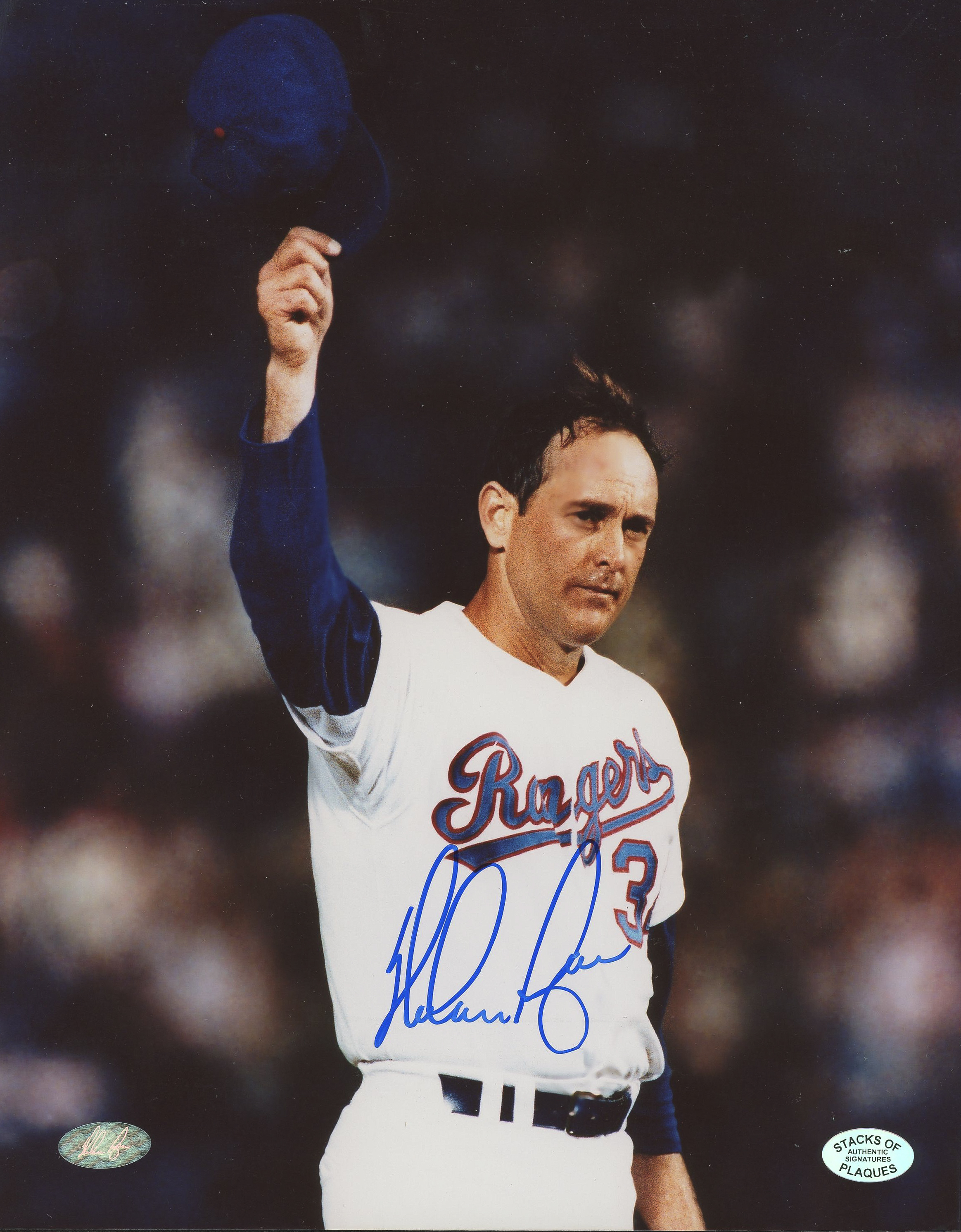 The autograph includes an official Stacks of Plaques - Est. 1985, Celebrating 30 years in the business - hologram and matching COA, as well as an official Nolan Ryan Hologram for authenticity purposes.