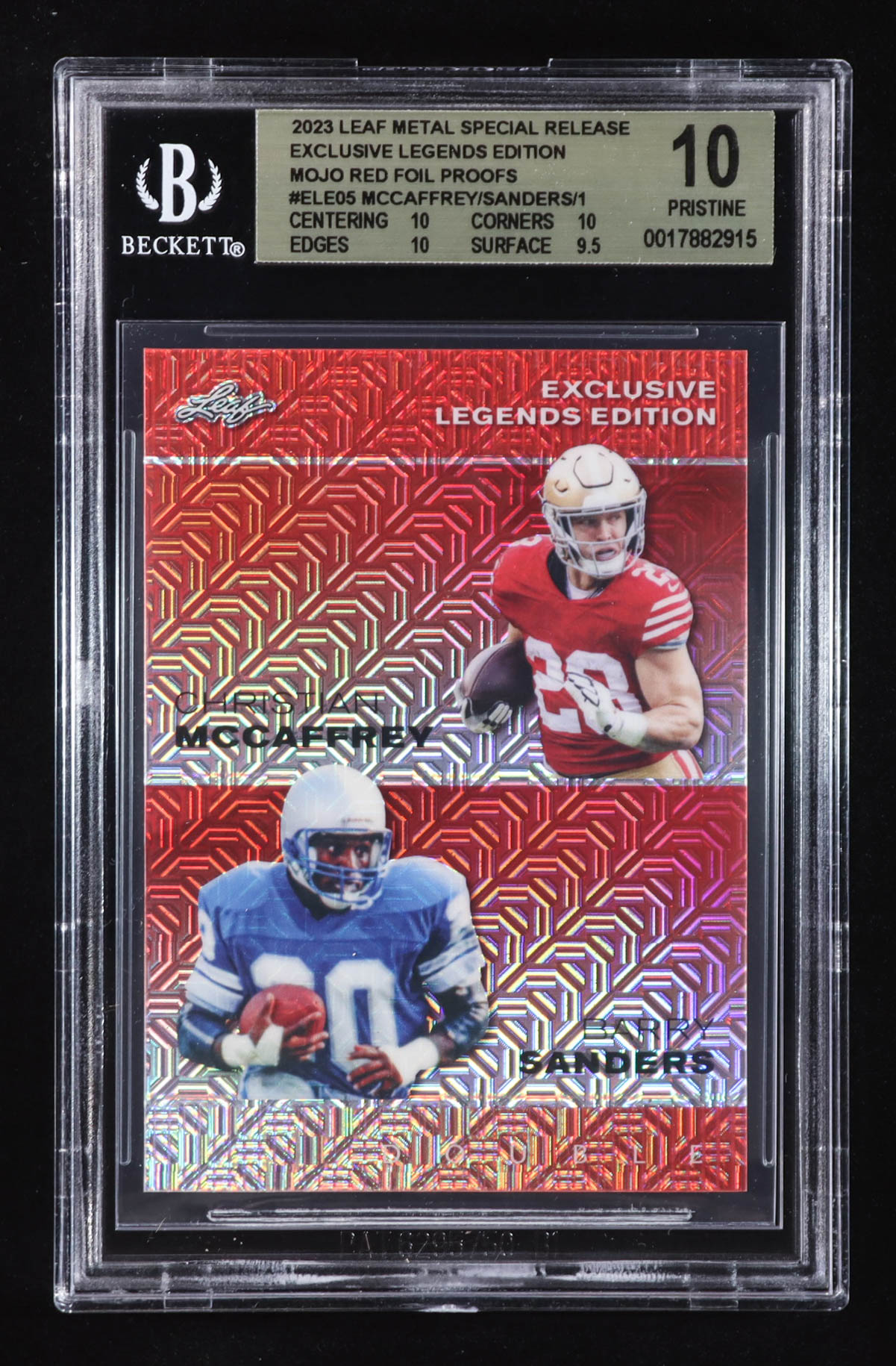 Christian McCaffrey/Barry Sanders 2023 Leaf Metal Special Release Exclusive Legends Edition Mojo Red Foil Proofs #ELE05 #1/1 (BGS 10)
