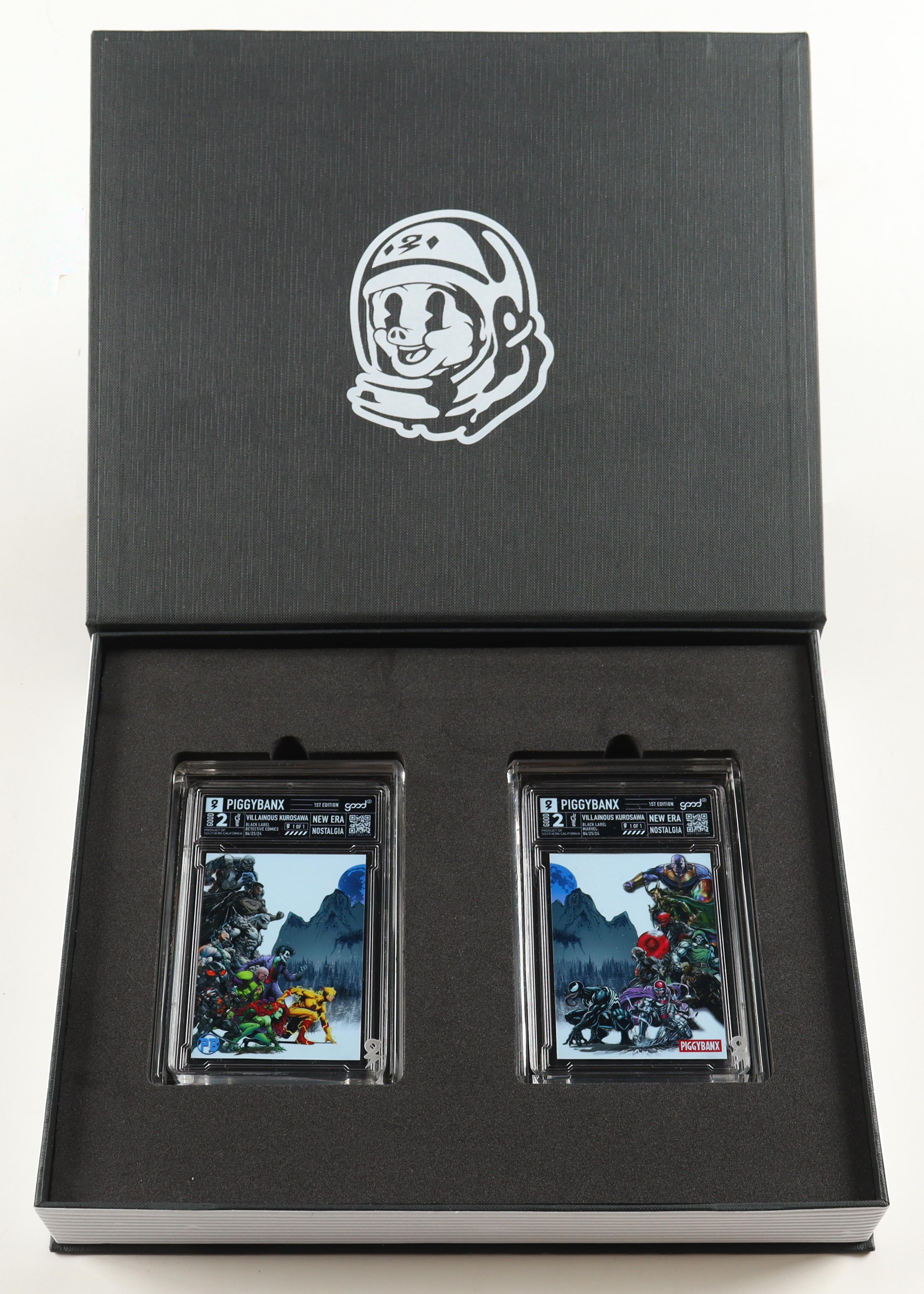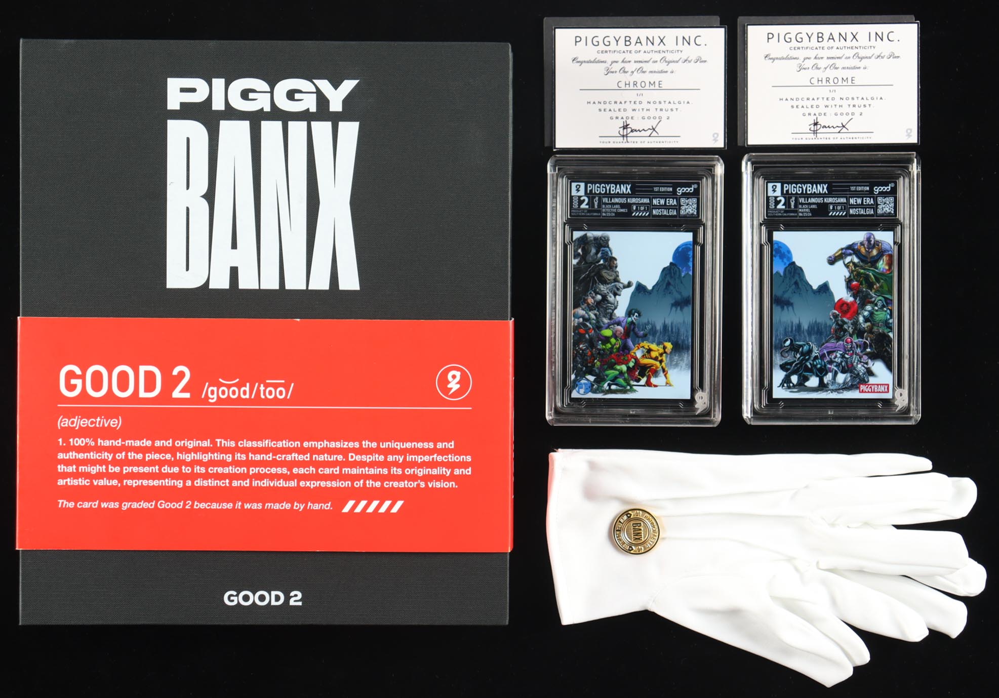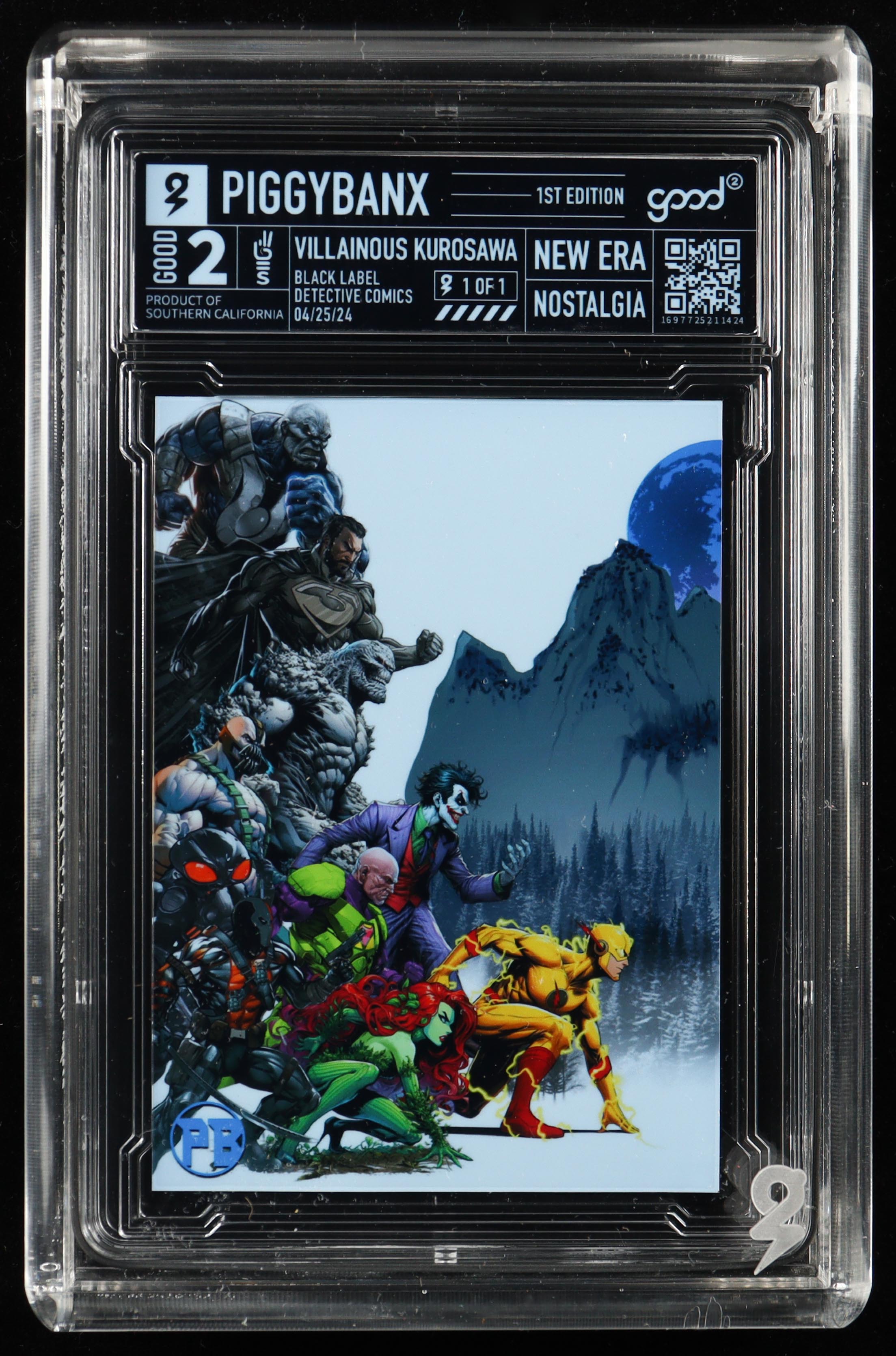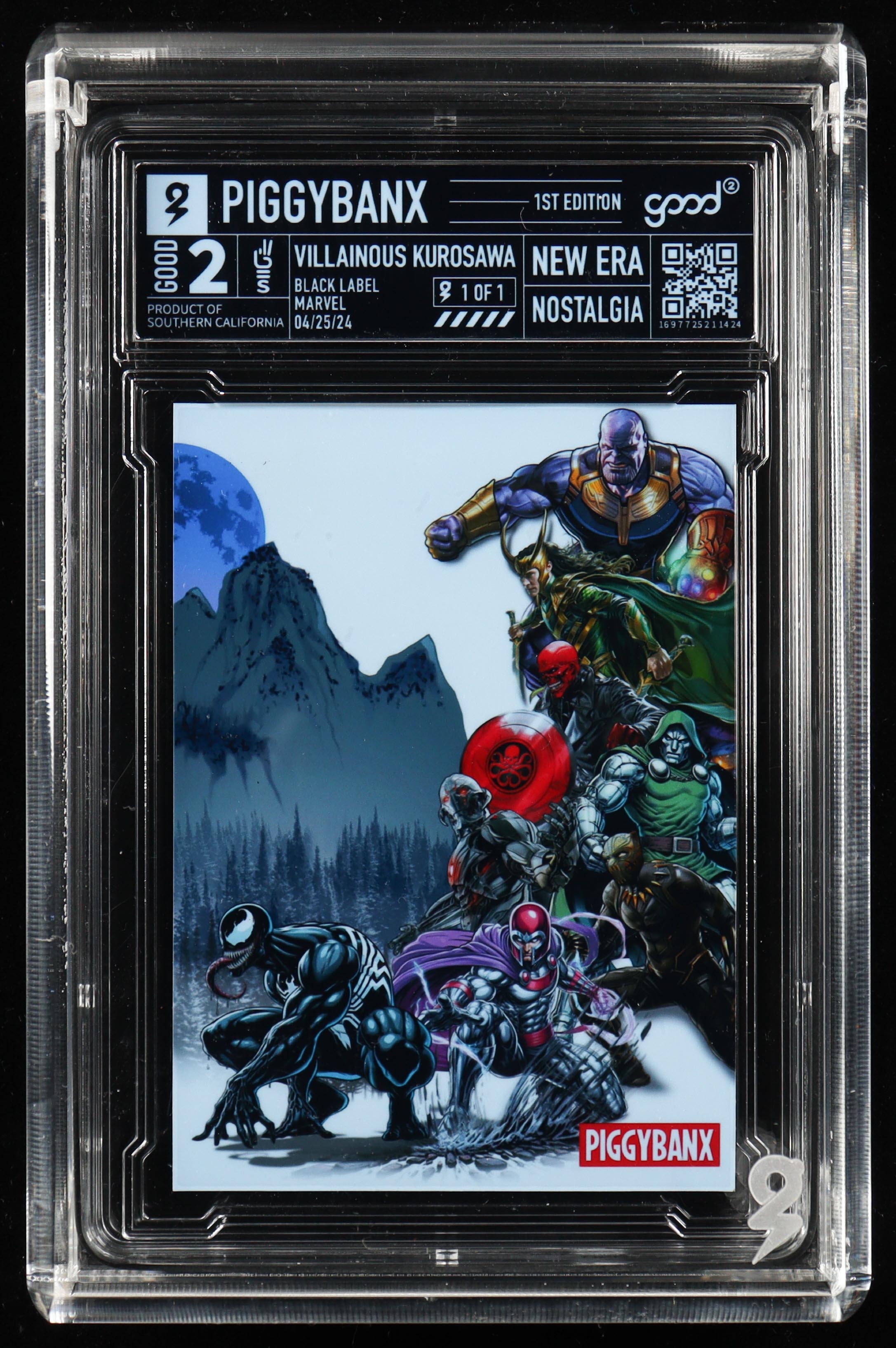 Set of (2) PiggyBanx Marvel & Detective Comics "Villainous Kurosawa" Good 1st Edition Chrome Refractor #1/1 with Display Box & PiggyBanx White Gloves