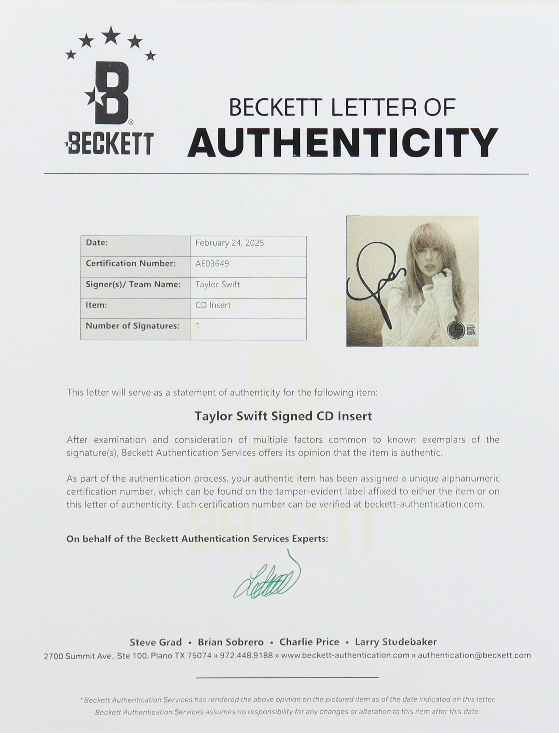The autograph includes an official Beckett Authentication Services hologram and matching LOA for authenticity purposes.