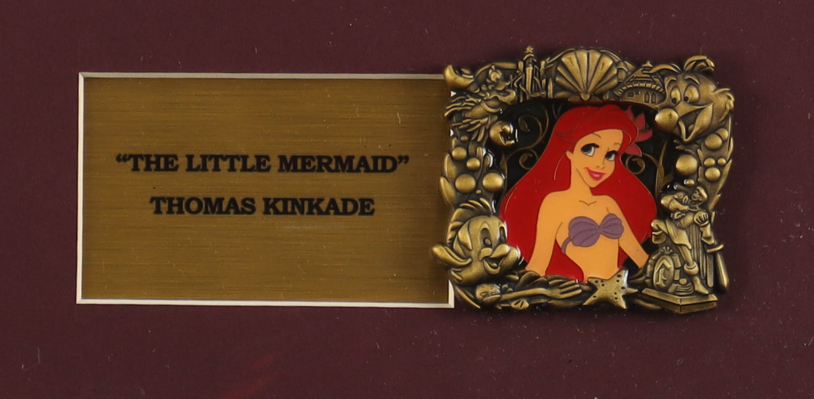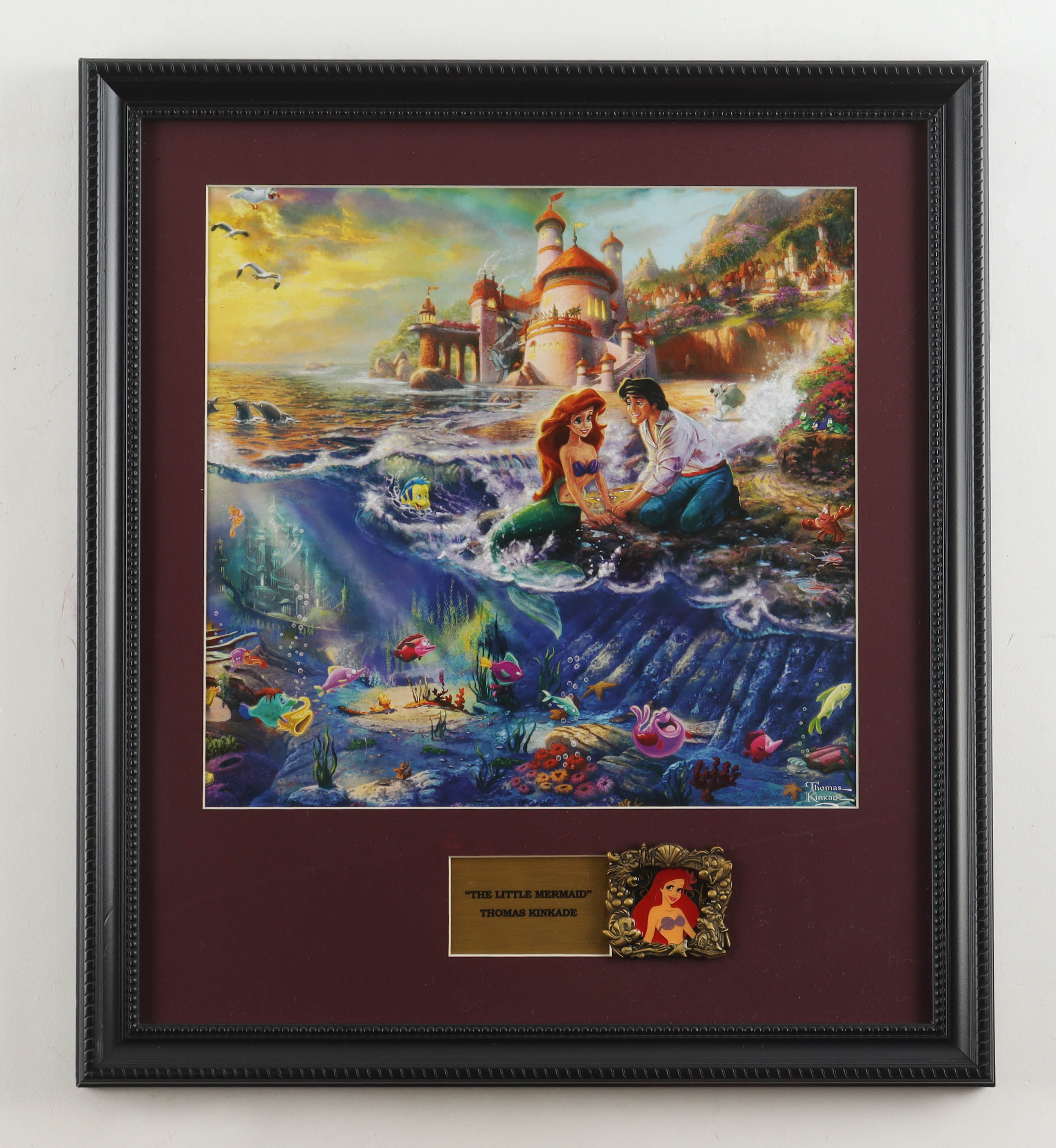 Custom frame measures approximately 16" x 18" in size and features a print of "The Little Mermaid" by Thomas Kinkade (D. 2012). The display also includes a Ariel Stained Glass Pin. The pin is limited edition out of 300. Please note, the display is unsigned.