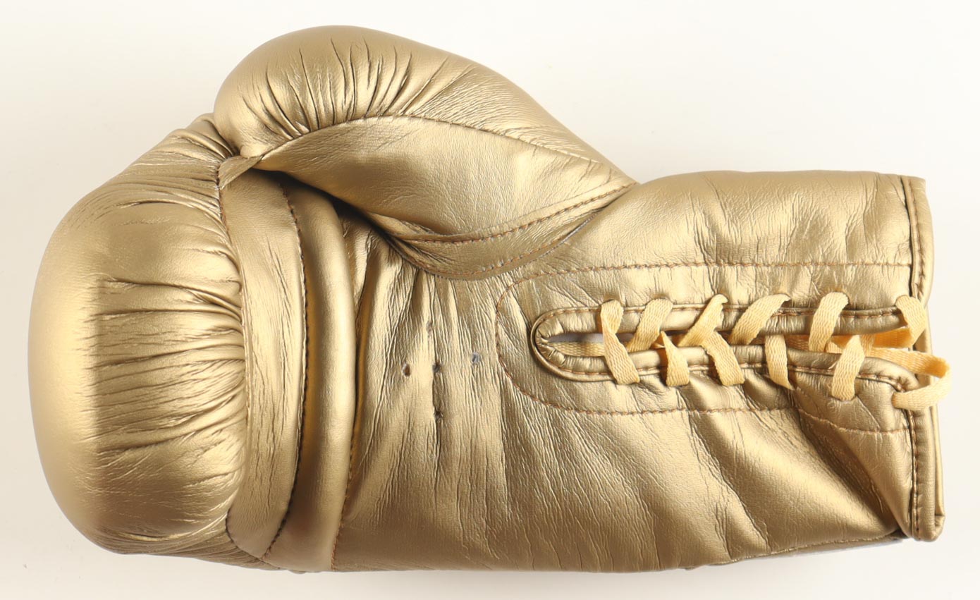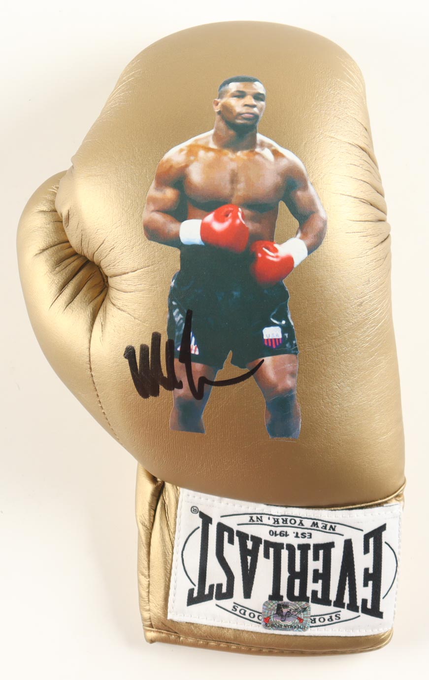 Gold Everlast Art Painted Boxing Glove has been hand-signed by Mike Tyson (HOF). Display case is included.