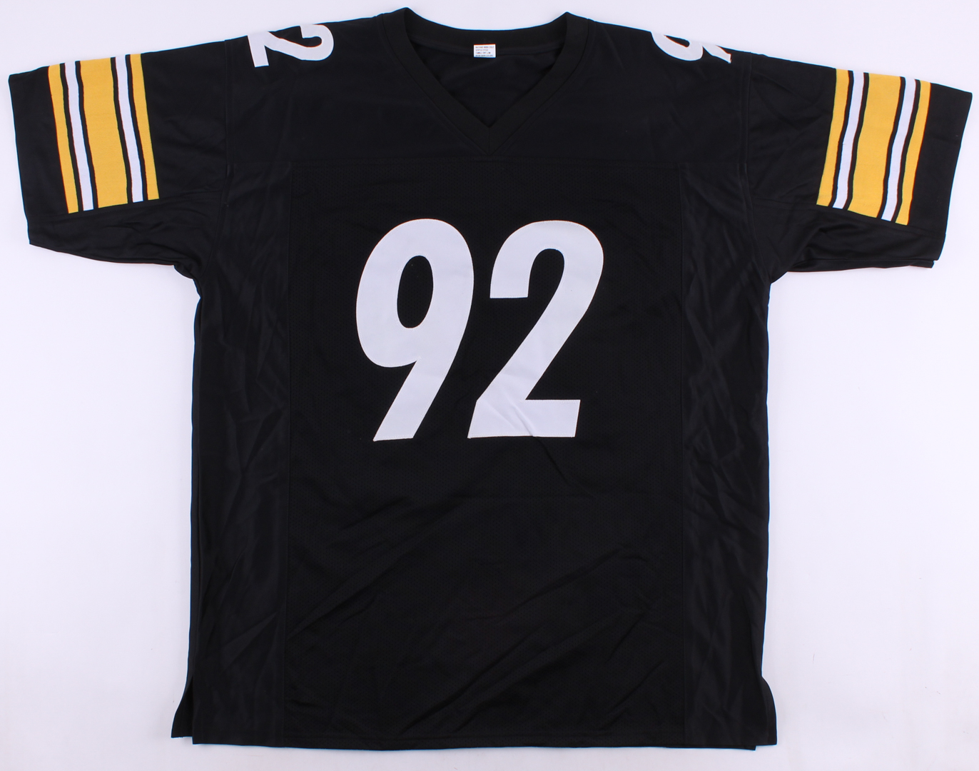 Custom on-field style jersey. Everything is sewn on, size XL. Hand-signed in black felt-tip pen by James Harrison.